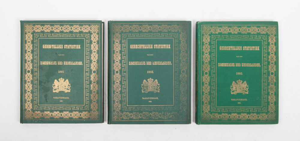 1881, 1883 and 1885. Den Haag, no publisher (Landsdrukkerij), 1882, 1884 and 1886, 3 vols., with numerous (folding) charts, original uniform gilt cloth, 4to (ex-library copies).