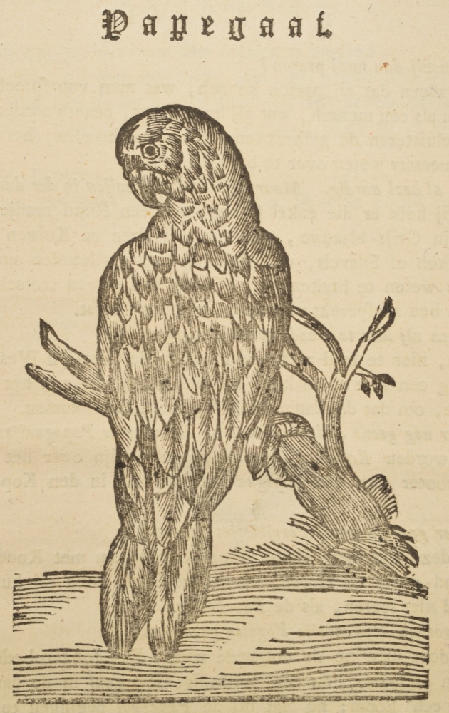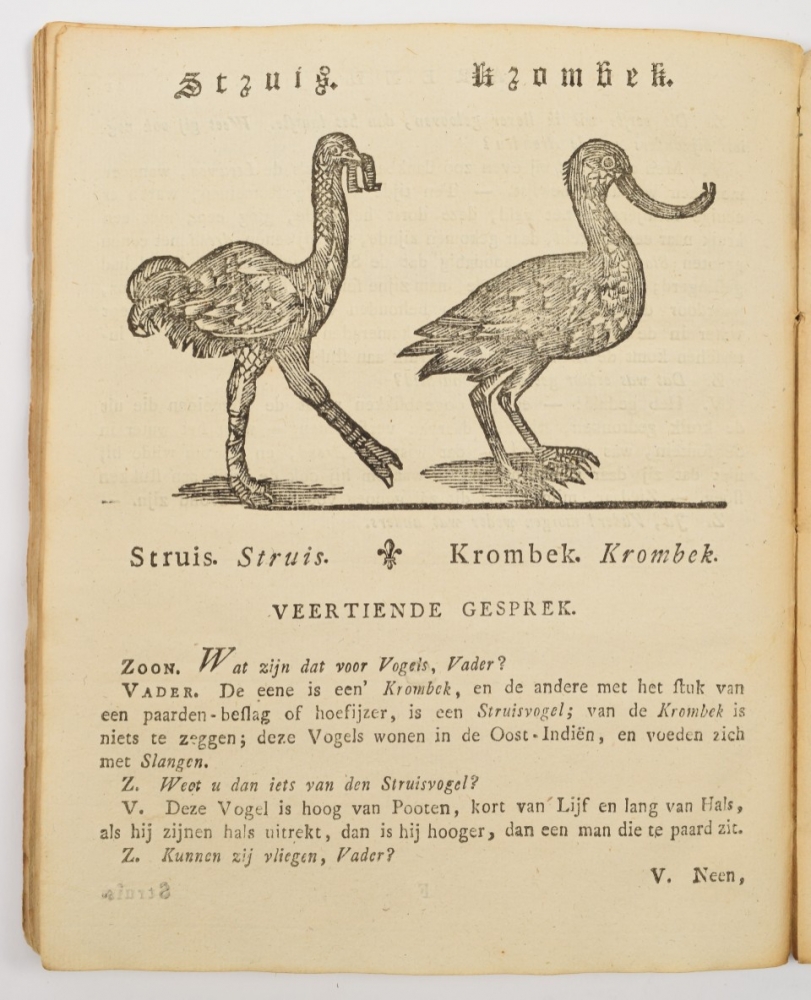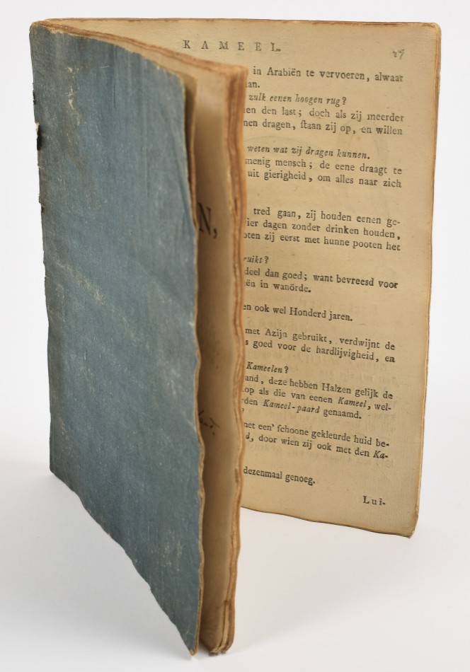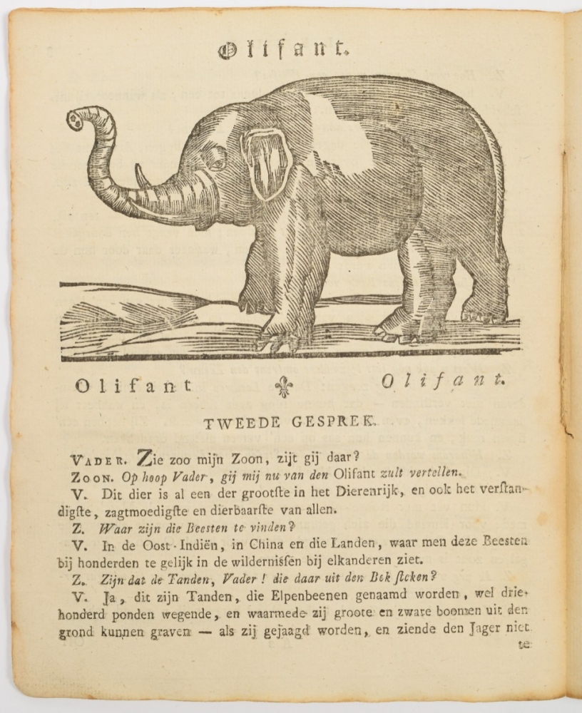 Small water stain in blank lower right corner at the beginning. Inside of wrappers stained, paper over spine lacking. A good copy, with contemp. annotation in pen on the title p.: "Provinciale Commissie van Onderwys in Friesland". Waller 1641; Muller 1085; Kinderen Lazen Kinderen Lezen 350. A very rare chapbook, only 1 copy in PiCarta (KB). The animals depicted and discussed in dialogue by a father and his son include the elephant, the rhinoceros, lion, ostrich, griffin, unicorn, porcupine, parrot, lobster and herring. Of the typical Dutch seafood, the herring, the father explains that there are many kinds: Vrouwtjes-haring, Jacobi-haring, Bartholomeus-haring, Kruis-haring (according to the months in which they are caught) and Volle-haring, Maatjes-haring, IJlen-haring, Kuitzieke haring and Homzieken haring ("alle deze soorten moeten ieder bij zijn soort ingepakt worden"). "Z. Is de haring gezond? V. Ja; van daar het spreekwoord - "Als de haring komt, rijden de dokters in gheene koetsen.""