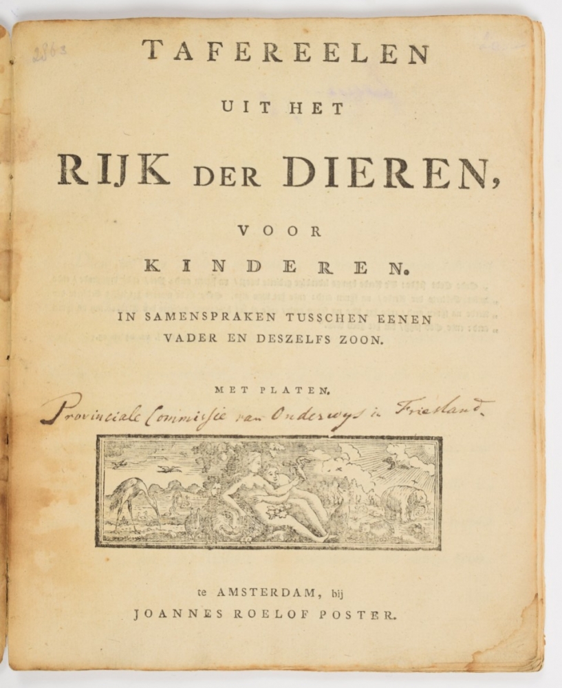 In samenspraken tussechen eenen vader en deszelfs zoon. Met platen. Amsterdam, Johannes Roelof Poster, n.d. (1811), (4), 68 p., with woodcut title vignette and 23 half-p. woodcuts of animals, contemp. blue wrapper, sm. 4to.