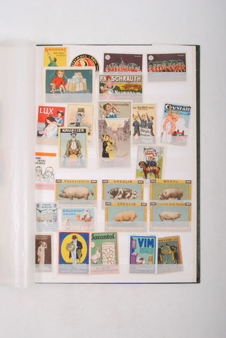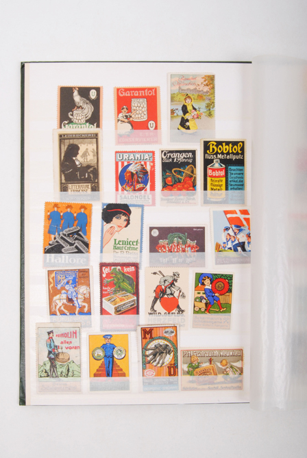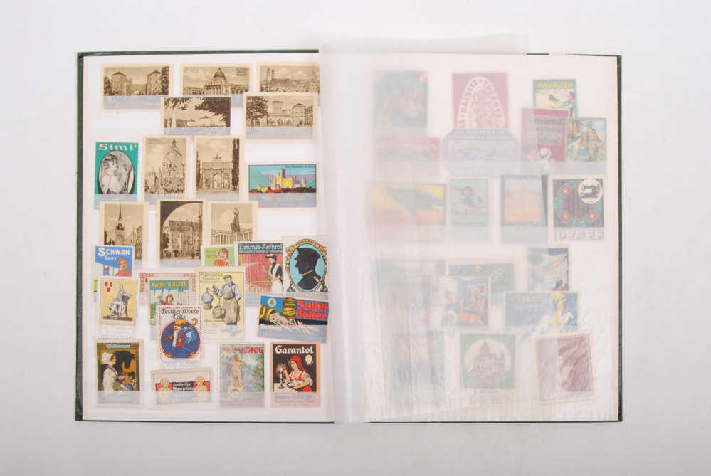 Album with 240 inserted picture stamps, mostly German, all pre-1940. Several damaged. Incl. 5 stamps of Kugel-Fabrik Fischer Schweinfurt, 1913.
