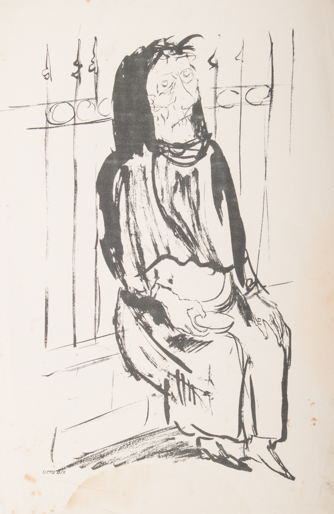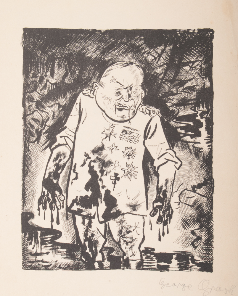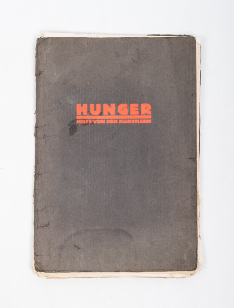 Hunger Hilfe von den Künstler. Künstlerhilfe. Otto Dix, George Grosz, Eric Johansson, Käthe Kollwitz, Otto Nagel, Karl Völker, Heinrich Zille, Für die Internationale Arbeiterhilfe. Neuer Deutscher Verlag, Berlin, 1924. Copy belonging to Nagel, signed in pencil with dedication "(..) nie vergessen. Leningrad juni 25, Otto Nagel", the plate by George Grosz is signed by Grosz. In poor condition, with dampstaining in the margin, wrinkles, tears etc. + Krieg. 7 Originallithographien. Gesamterlös von der Künstlerhilfe. Otto Dix, George Grosz, Otto Nagel, Käte Kollwitz, Willibald Krain, Rudof Schlichter, Heinrich Zille. Zum 10. Jahrestage des Kriegsbeginnes. Neuer Deutscher Verlag, Berlin, 1924. No cover, inserted in former collection. Lacks the print by Dix.