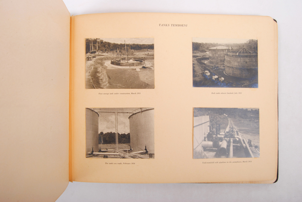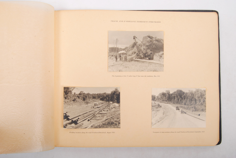 Crude oil transport project New Guinea. The Netherlands' New Guinee Petroleum Company LTD October 1952-August 1954. Werkspoor N.V. Amsterdam, 1955. Oblong album with 64 mounted photos each of 8 x 11 cm and a general print. Probably intended for board members and important business partners.