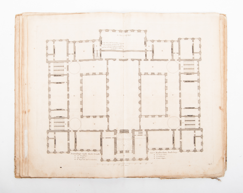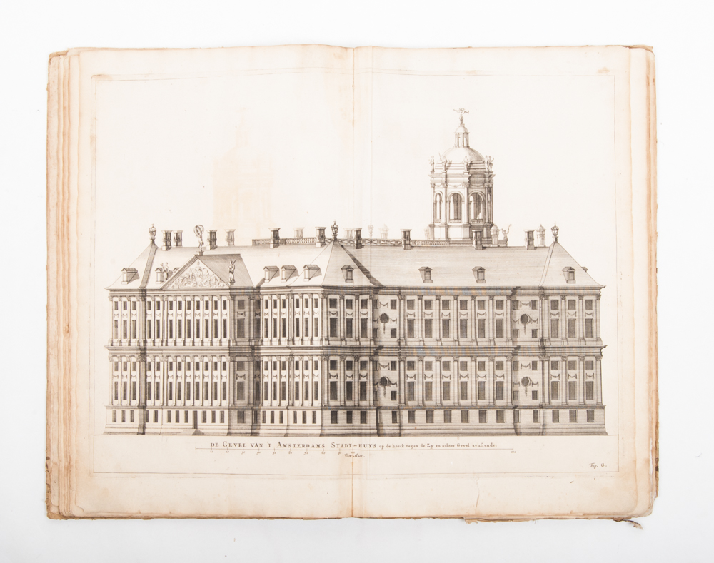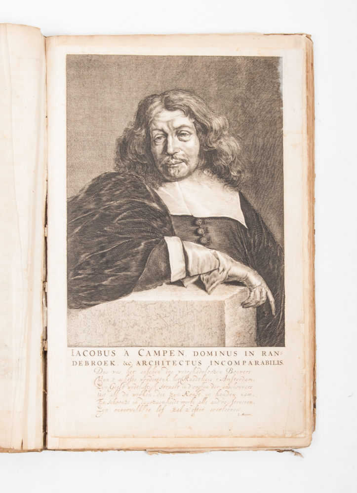 In dartigh coopere plaaten geordineert door Jacob van Campen en geteekent door Jacob Vennekool, Amsterdam, Dancker Danckerts, 1661. Folio, half parchment and cased, title in hw. on spine, illus. title page, portrait of the author, (4),12 pp. complete on 24 leafs, several of which folding and counted twice (O,P.S.V.) and thrice (T). Shabby binding, var. prints with frayed edges, var. pages reinforced with paper.