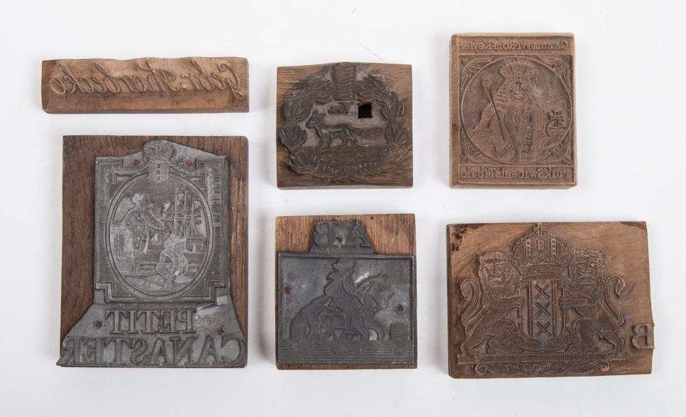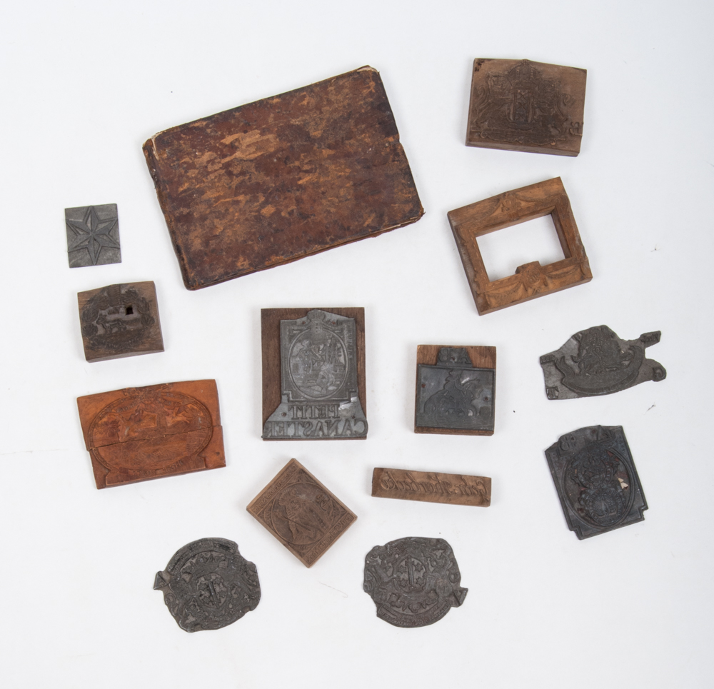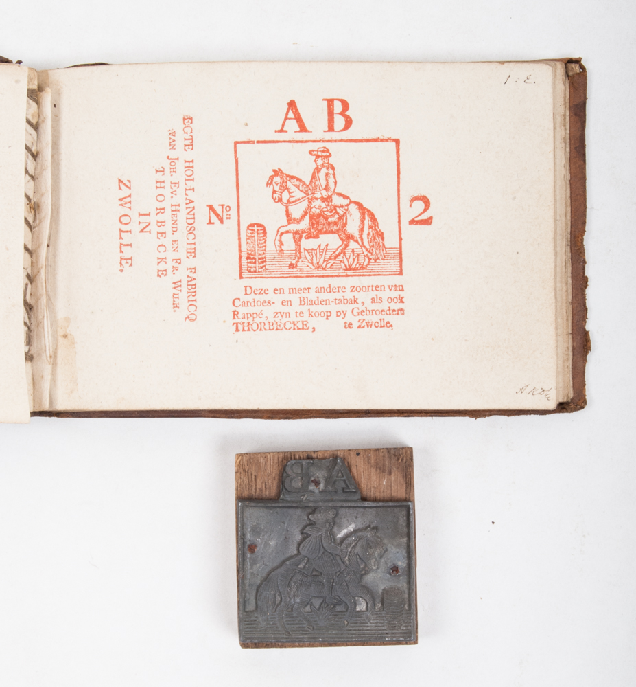 Echte Hollandsche Fabricq van Joh. Ev. Hend. en Fr. Wilh. Thorbecke* in Zwolle. Sample book with 22 tobacco packages, ca. 1800. Oblong, bound in leather + 13 original stereotypes for the printed tobacco stamps.