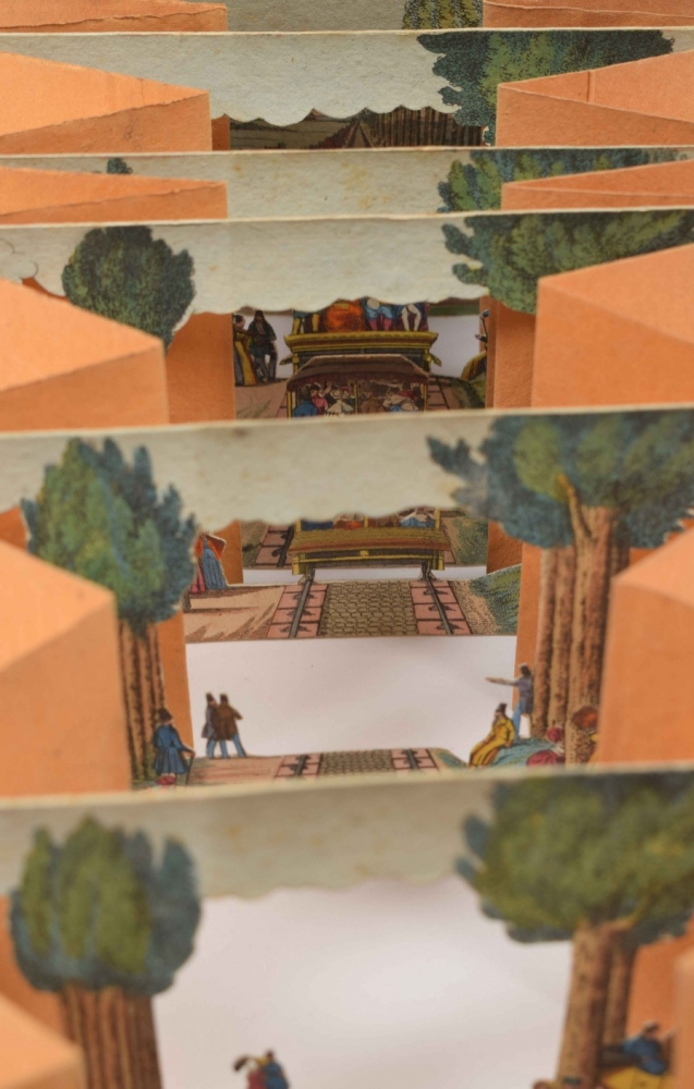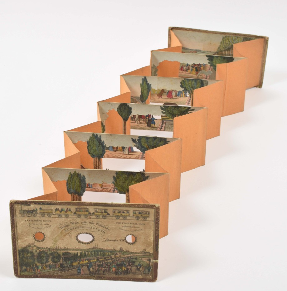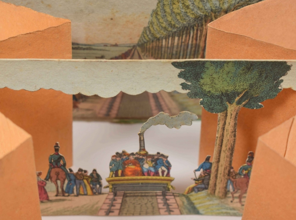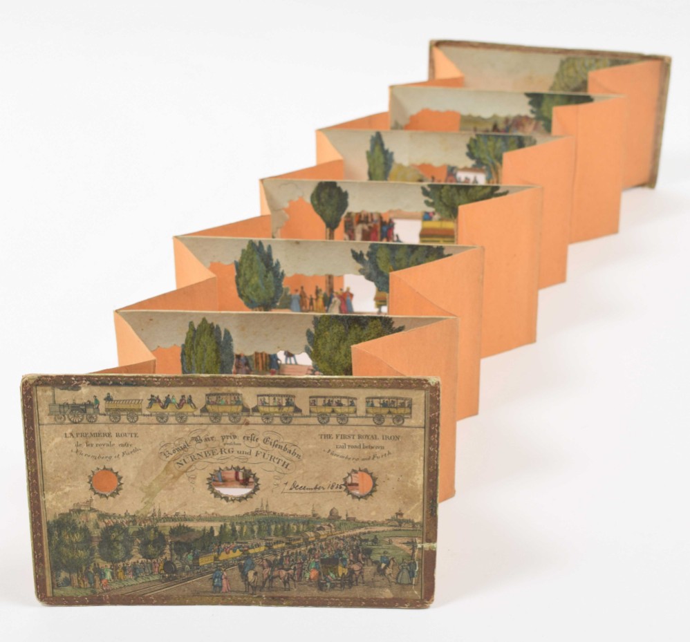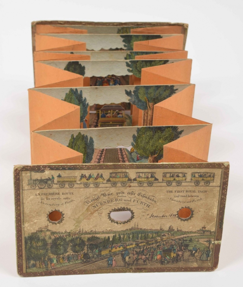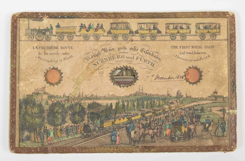 Königl. Bair: priv: erste Eisenbahn zwischen Nürnberg und Fürth / La Premiere Route de fer royale entre Nuremberg et Furth/ The First Royal Iron rail-road between Nuremberg and Furth. Handcoloured etched railway scene. Top with 3 holes for viewing through 5 handcoloured etched sectional plates and background mounted on end board. Handwritten date on board "7 December 1835". Boards slightly rubbed, else a fine copy of this charming and rare peepshow.