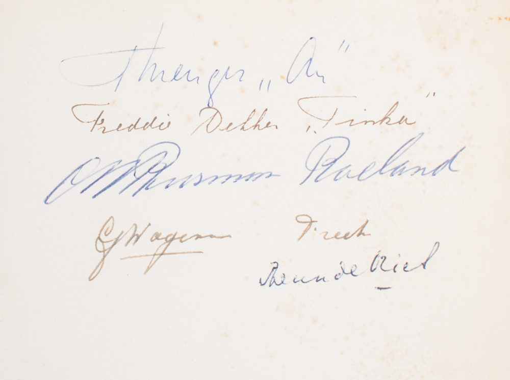 Extraordinary copy: signed on the endpaper by 4 persons on whom characters from the book are based, members of the resistance group that freed author Theun de Vries from Amersfoort concentration camp. Truus Menger-Oversteegen ("An") and her sister Freddie Dekker-Oversteegen ("Tinka") (on 15 April 2014 both resistance sisters were decorated with the Mobilisatie-Oorlogskruis by Dutch PM Mark Rutte); Cor Rusman ("Roelant") (Rusman was a bricklayer, Roelant too); Gerben Wagenaar ("Freek") (in real life he was nicknamed "Blonde Freek", see http://nl.wikipedia.org/wiki/Gerben_Wagenaar).
