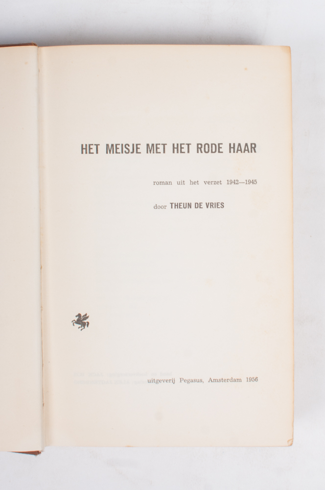 Roman uit het verzet 1942-1945 door Theun de Vries. Amsterdam, Pagasus, 1956, 1st ed., 599 p., original gilt lettered cloth.