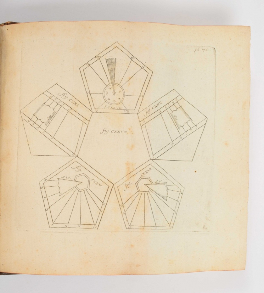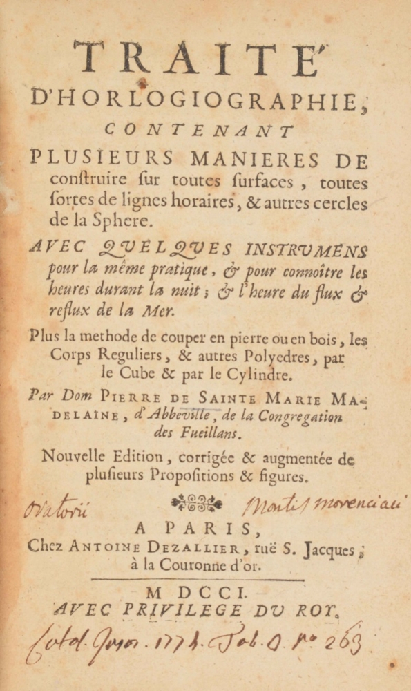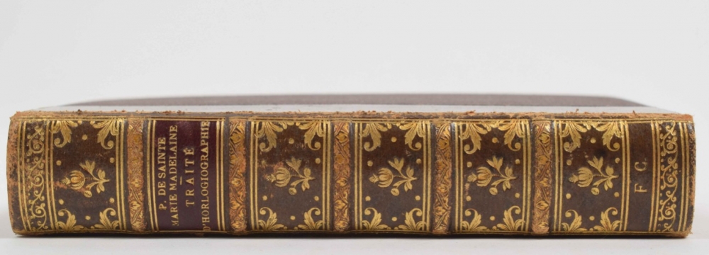contenant plusieurs manieres de construire sur toutes surfaces (...) Plus la methode de couper en pierre ou en bois, les corps reguliers, & autres polydres, par le cube & par le cylindre. D.P. de St. Marie Madelaine. Paris, Antoine Dezallier, 1701. (6), 294 pp. Containing 72 engraved (folding) plates. Rebound in halfleather, richly gilt spine with title vignette, 8vo.