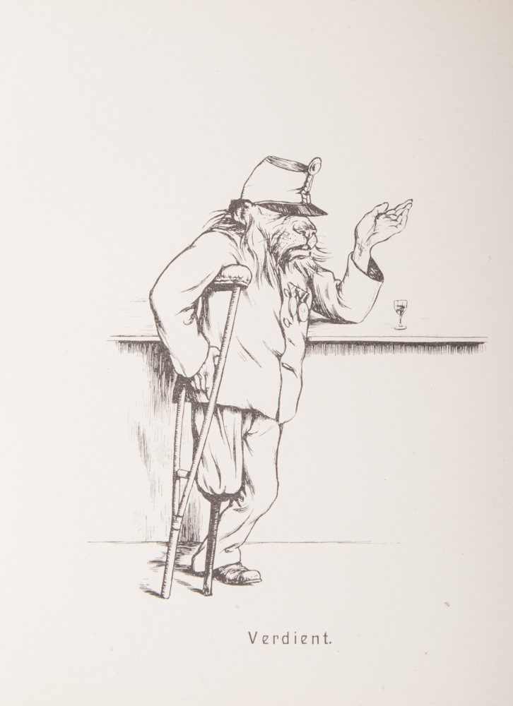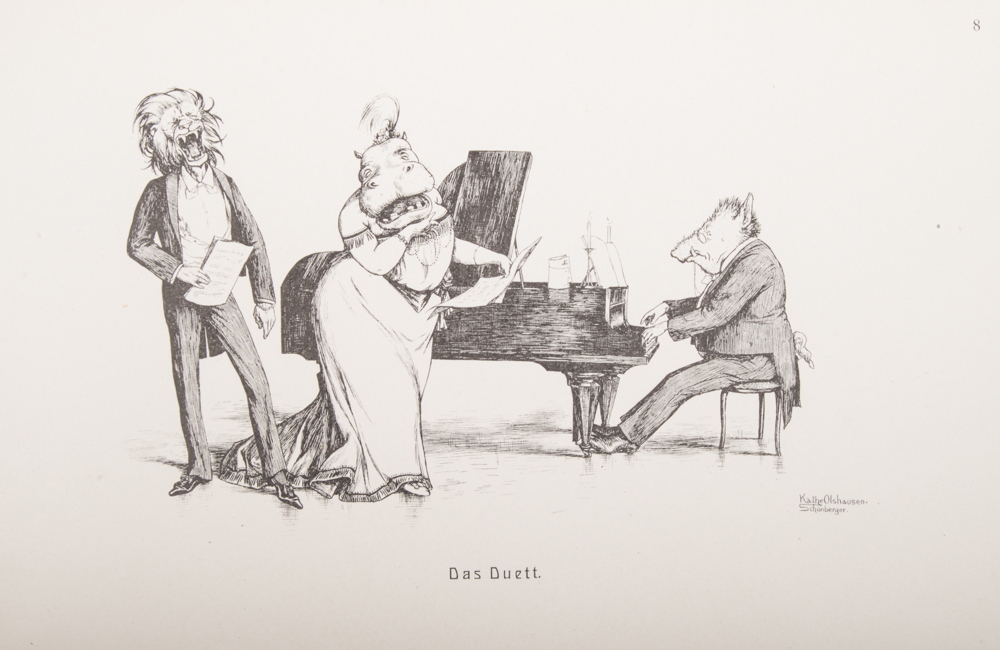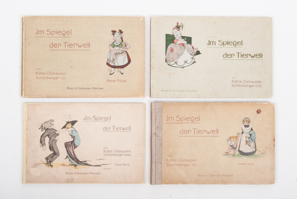 Käthe Olshausen-Schönberger, Braun & Schneider, Munich, [1907]. 32 one-sided pages with caricatures. Bound with illus. binding + Neue Folge, dritter en vierter Band. Last two with professionally restored binding.