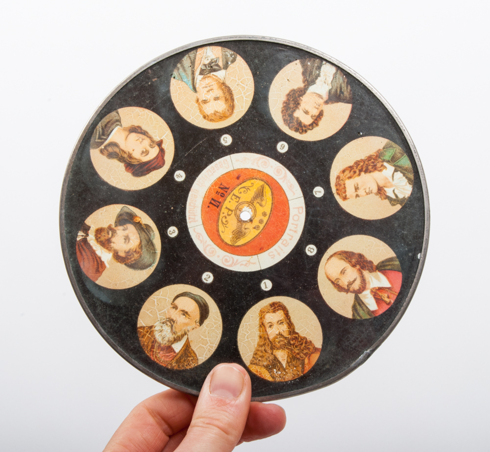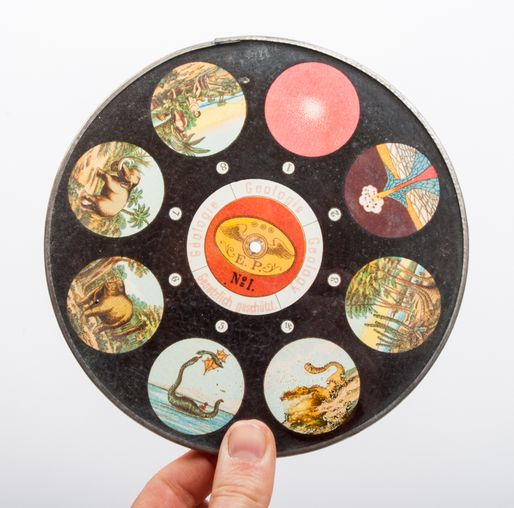 Copper stereoscope, Germany, ca. 1880. With set of 6 round discs (Menschenrassen, Portretten, de Gelaarsde Kat, Robinson Crusoë, Geografie and 1 other (Plate II, dam. and therefore illegible)). Size 19 x 25 cm. on wooden stand in original wooden box - and extension piece and 2 additional glass plates.