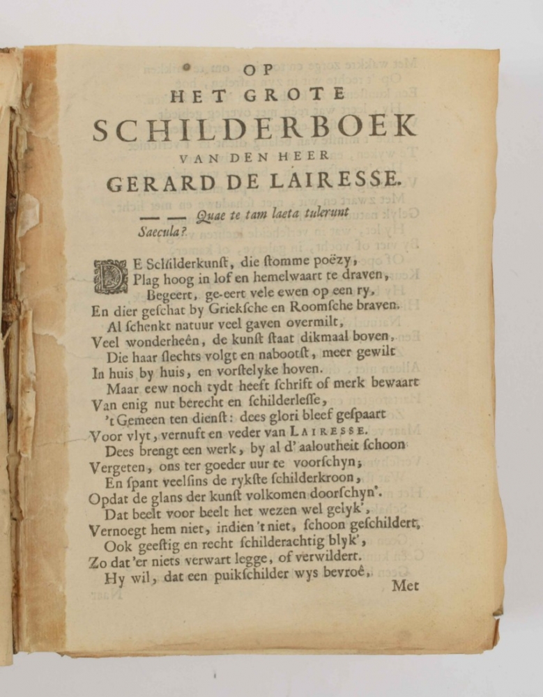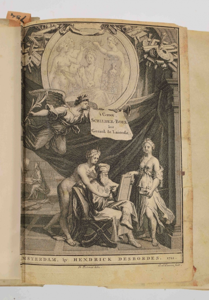 grondig werd onderwezen, ook door redeneeringen en printverbeeldingen verklaard; met voorbeelden uyt de beste konst-stukken der oude en nieuwe puyk-schilderen bevestigd. Gerard de Lairesse. Amsterdam, Hendrick Desbordes, 1712. 2 parts in 1 vol. (12), 434, (36); 115 pp. Complete with all engravings and allegorical frontispiece. Vellum, 4to.