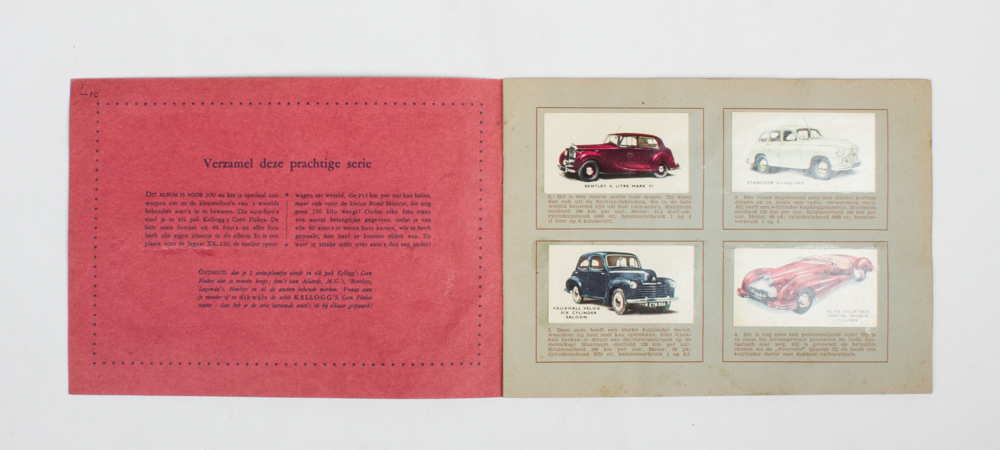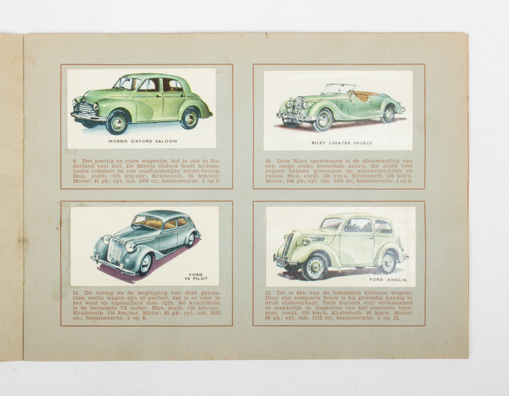 1949. Stapled. 12 pp. Auto-album voor je verzameling van 40 moderne Engelse auto’s, pictures l to 40, picture with English text, album Dutch.