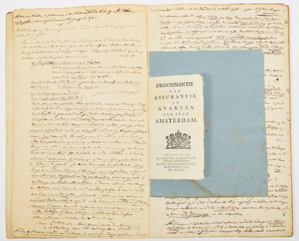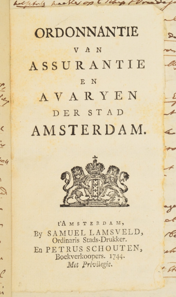 der stad Amsterdam. Amsterdam, S. Lamsveld and P. Schouten, 1744 (but with additions up to 1756), (2),80,(1) p., 12mo, interleaved with the same amount of pages in folio, 25 of those pages with manuscript annotations (remainder blank) concerning the juxtaposed articles in the booklet, applied to real assurance cases, with many names of people involved and the (Dutch East India Company) ships, sums of money and dates 1765-1776, contemp. limp boards, folio.