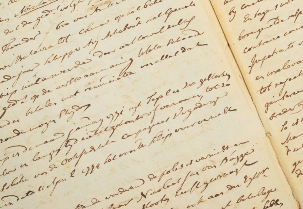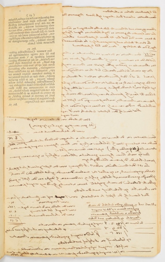 PiCarta only lists variants with fewer pages and (as can be seen in the digitised copies) with a typographically different title p. The booklet, signed in letterpress by N. Geelvinck de Jonge (1756) and H. Bicker (1744) at the end, lists 55 articles on maritime insurance law. The manuscript annotations could be an important source of information about the insurance side of lost or damaged ships, in addition to the manuscript "Averijgrossen" (1700-1810) kept at the Stadsarchief Amsterdam. The manuscript starts with the annotation "Notitie van stukken (...) inde saak van David Valentijn (...) Toonder (...). P. v.d. Broeke en Zoon, per procuratie van de Assurantie Compagnie te Middelburg (...)". The first ship mentioned is the V.O.C. ship "Vreedejaar", built in 1769 for the chamber of Enkhuizen, of which the skipper was Ary Arkebout, who is also mentioned in our manuscript. This large ship (crew of 221 men) went missing in 1771 between Patria and the Cape of Good Hope. Its destination was Canton (source: De VOCsite). Apparently, the owner of the ship was David Valentijn. Other ships mentioned include "El Pulido" (captain Pedro de la Villa, with loosely inserted text by Johan van Soestdijk) and the ship "De Hengelaar" (skipper Teunis Claasen).