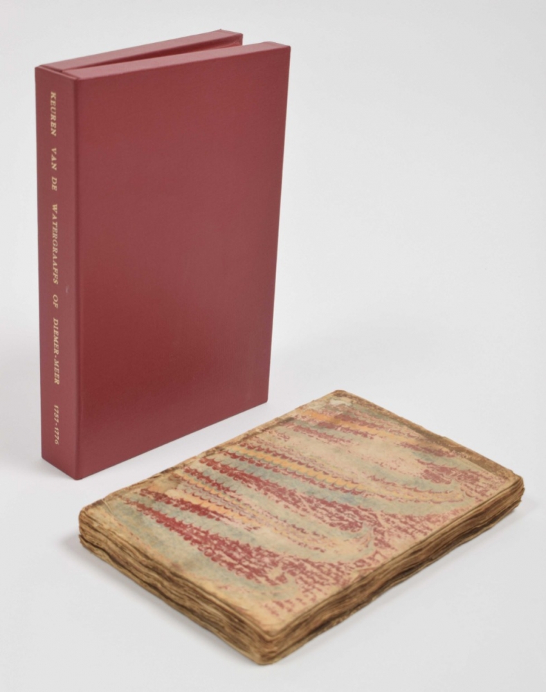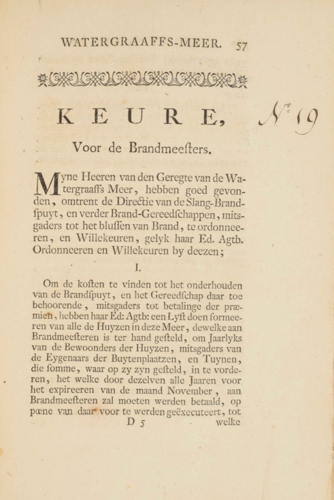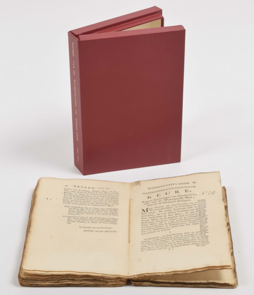 This copy has survived a fire: edges and spine smoke-stained; the index at the beginning has a few contemp. manuscript entries, apparently because quire H (paginated *105-*112) was added later as are the last 20 pages, all paginated *000. The "Keuren" are neatly contemp. numbered 1-47. A few of the "Keuren" as listed in the index: "Branden van Stroo, en ander Ruygten"; "Dyk hoe, in tyd van nood te conserveeren"; "Feestdagen niet te werken"; "Hengelen"; "Honden"; "Kroeghouden"; "Maliebaan, speelen in de" (manuscript entry); "Nachtegaalen niet te vangen"; "Reyden, en Wyken van Wagens en Karren"; "Sterfhuizen geen Goederen te ontvreemden"; "Stooren der Nachtegaalen"; "Tabakrooken verbooden" (manuscript entry); "Vechten"; "Verbod tegens het werken op Sondagen en Feestdagen"; "Visschen" and "Zetting en Gewigt van Brood".