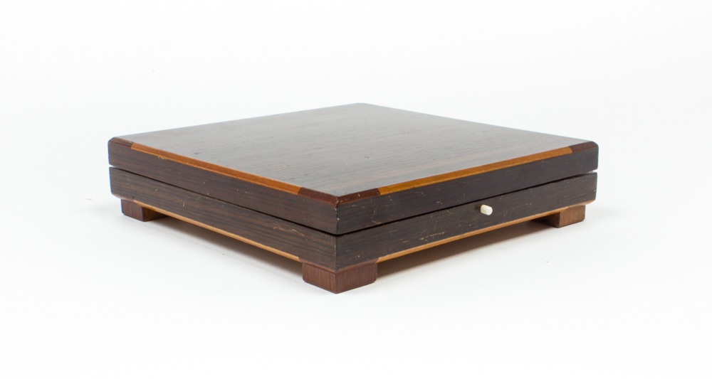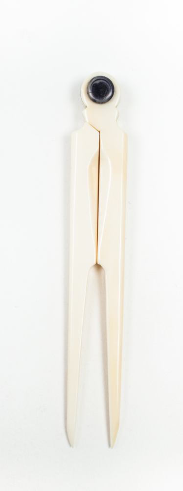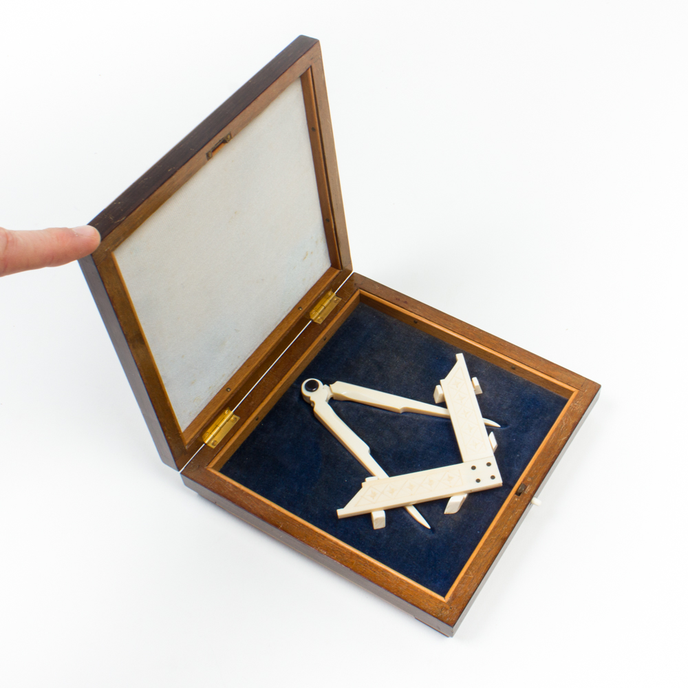 Treated ivory square and compasses in original wooden box with plain lock. 18 x 18 x 3 cm.