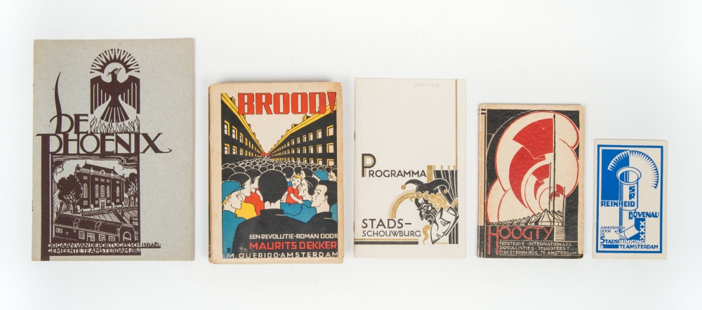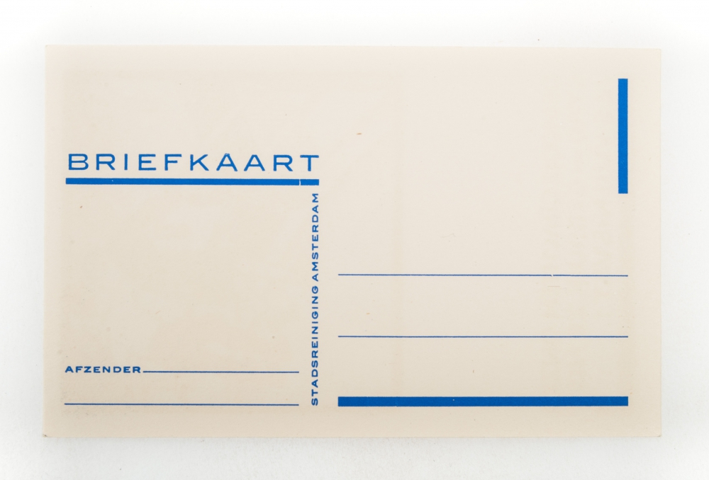 Aangeboden door de Stadsreiniging te Amsterdam. Serie B. Amsterdam, Stadsdrukkerij, n.d. (1935), series of 6 picture postcards with linocuts heading pedagogic aphorisms, printed in blue, kept in the original thick paper cover with design by the same, 15 x 9.5 cm.