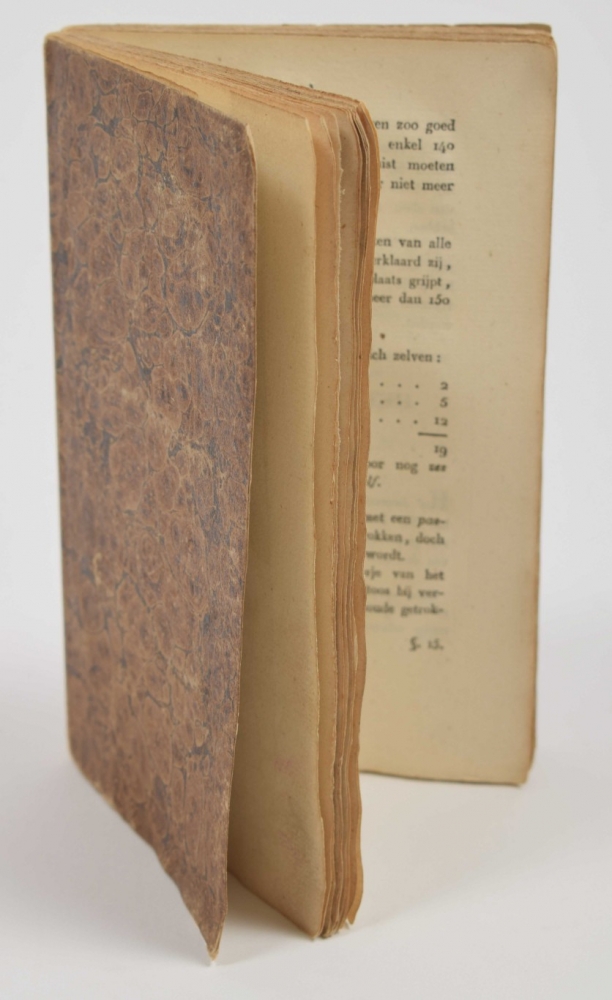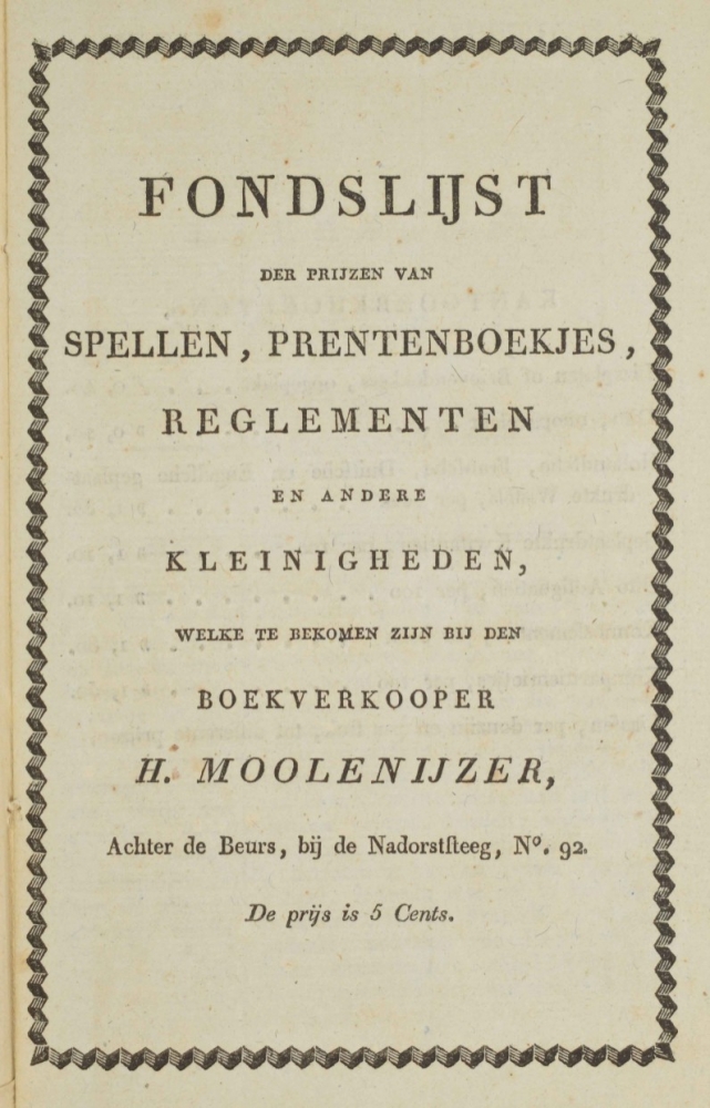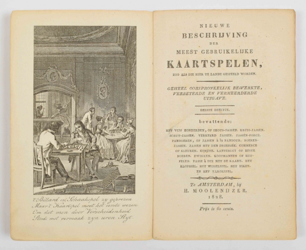 zoo als die hier te lande gespeeld worden (...) bevattende: Het vijf honderden, of smous-jassen, kruis-jassen, schut-jassen etc. Amsterdam, H. Moolenijzer, 1828. VIII, 104, 16 pp. Engraved frontispiece. Marbled boards, 8vo. Bound with Fondslijst der prijzen van spellen, prentenboekjes, reglementen en andere kleinigheden, welke te bekomen zijn bij den boekverkooper H. Moolenijzer.