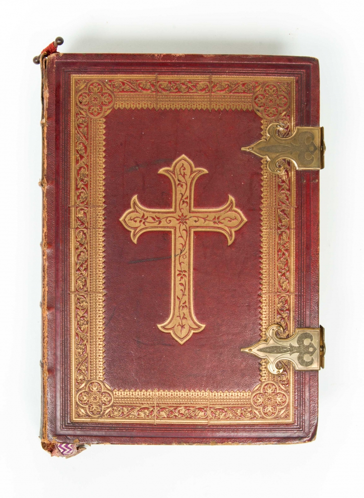 Folio, late 19th-century red morocco binding, title on spine in gilt stamping, boards with line embroidery, roll stamps and central ornament (cross) in gilt stamping. Clasp with metal mounting, multiple ties, endpapers ivory paper, title in red and black with large illustrated vignette. The text printed in red and black in 2 columns, decorated capitals and music print. The many copperplates inside and outside the text by C. Galle, being 19th-century prints of the original 17th-century plates. Various text and music leaves inserted. Spine and endpapers dam., somewhat tanned, else good copy with accompanying lectern (height 24 cm.).