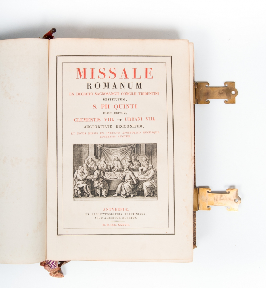 Ex Decreto Sacrosancti Concilii Tridentini restitutum, S. Pii Quinti jussu editum, Clementis VIII et Urbani VIII auctoritate recognitum, et novis missis ex indulto apostolico hucusque concessis auctum. Antverpiae, ex architypographia Plantiniana, apud Albertum Moretus. 1837.
