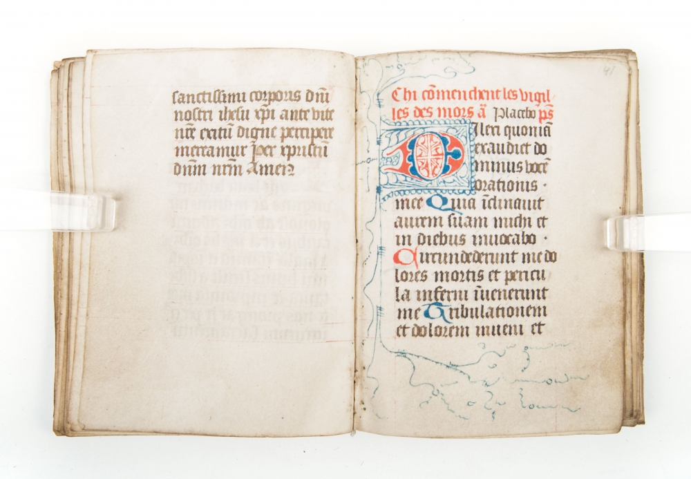 Structure: after the penitential psalms, the Litany of the Saints begins on verso leaf 14. On leaf 32 (with large initial on verso) the following title: "Nostre tres saint pere sixtus le quart a copose le quatrisme & chincquisme suffra de lorison (...) qui la vient la quelle come est XLVI mille ans et XII ans & XL jos." This is no date but an indication of the number of years of "forgiveness" one could earn (Pope Sixtus IV, 1414-1484). On leaf 41 (with pen writing) the following title: "Chi comenchent les vigiles des mors ä". The last part of the main part (with pen writing) begins on leaf 77: "Le pape Jehan XIIe a copose ceste orison (...)."