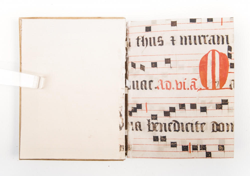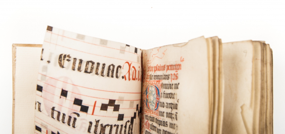 Manuscript in pen and red ink (French text) and brown ink (Latin text) on vellum, France, 2nd half 15th century, 84 leaves, with 3 leaves decorated with large initial in red and blue and pen writing in the margin, another large initial and many small initials in red and blue, modern vellum binding in old style (vellum endpapers of antiphonary leaf), 10.7 x 8.5 cm.