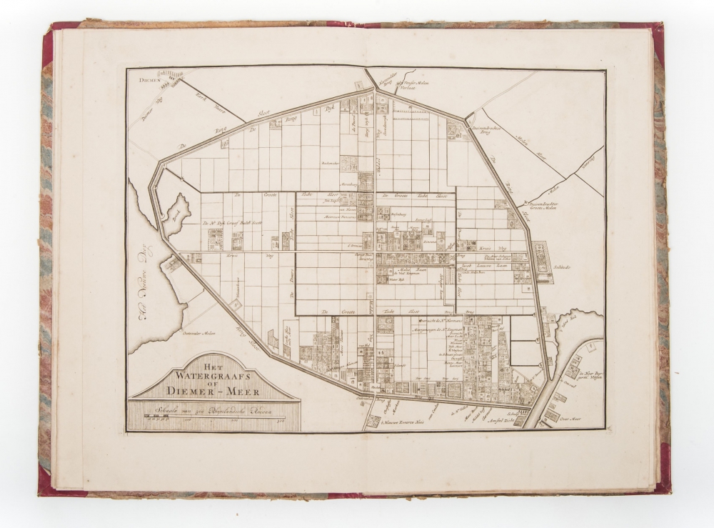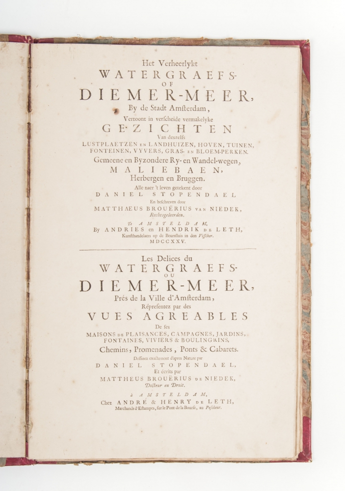 By de Stadt Amsterdam, vertoont in verscheide vermakelyke gezichten van deszelfs lustplaetzen, en landhuizen, hoven, tuinen, fonteinen, vyvers, gras- en bloemperken. Gemeene en Byzondere Ry- en Wandel-wegen, Maliebaen, Herbergen en Bruggen. Alle naer 't leven getekent door Daniel Stoopendael en beschreven door Matthaeus Brouërius van Niedek, Rechtsgeleerden. Amsterdam, A. en H. de Leth, 1725, (40) p. text, with 1 double-page engraved map (of 2), half-page map of Amsterdam, half-page historical map of the area and 40 (of 60) engraved views on 20 (of 30) leaves, contemporary half goatskin, folio.