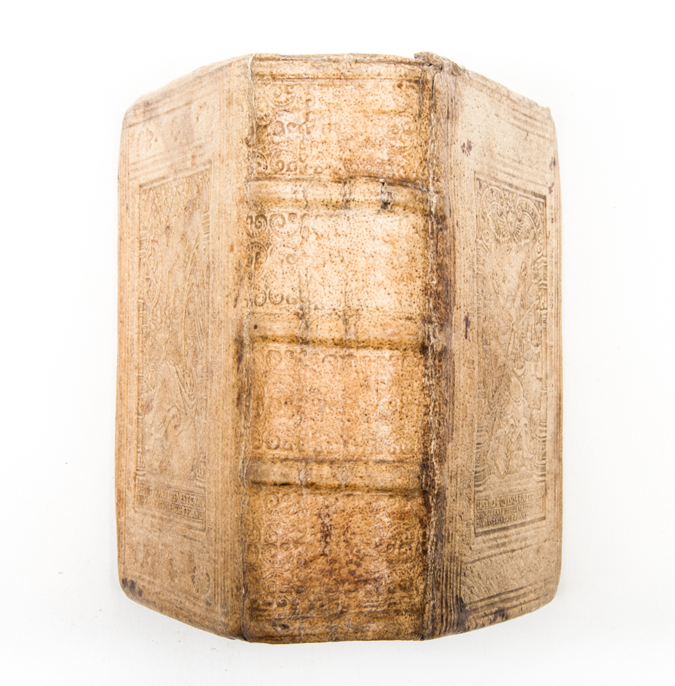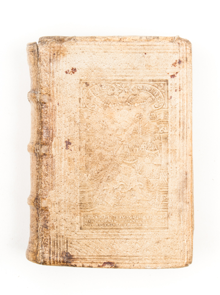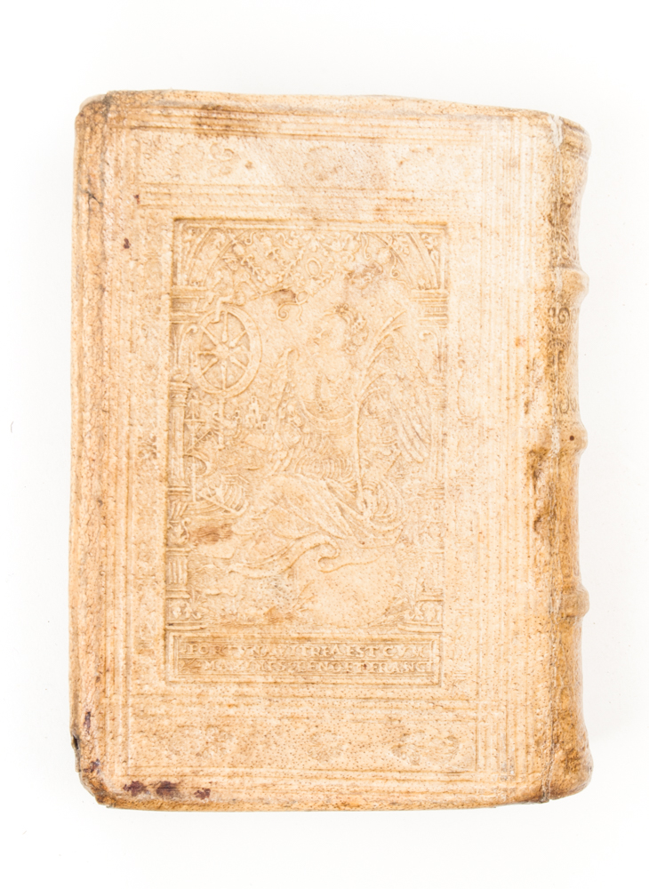 The scarce first printing of this edition edited by Willem Canter (1542-1575). On Canter, see: https://en.wikipedia.org/wiki/Willem_Canter. The text is printed in a beautiful small type. Copy in a special binding, with a panel on the front board monogrammed "S.R." with the figure of Justitia and the text "Iusticiae quisqs pictura lumine cernis dic deus est iustus iustaq facta probat." On the back board a panel with the same monogram and the figure of Fortuna above the text "Fortuna vitrea est cum maxime splendet frang[itur]" ("Fortune is like glass—the brighter the glitter, the more easily broken", a quote from Publius Syrus). Both panels are highly detailed and extraordinarily well preserved, a fine example of the art of Renaissance book binding.