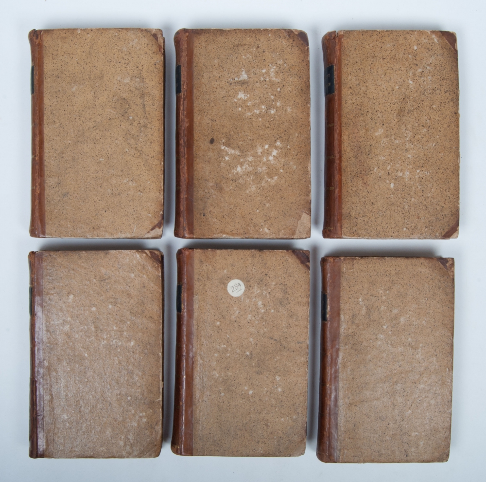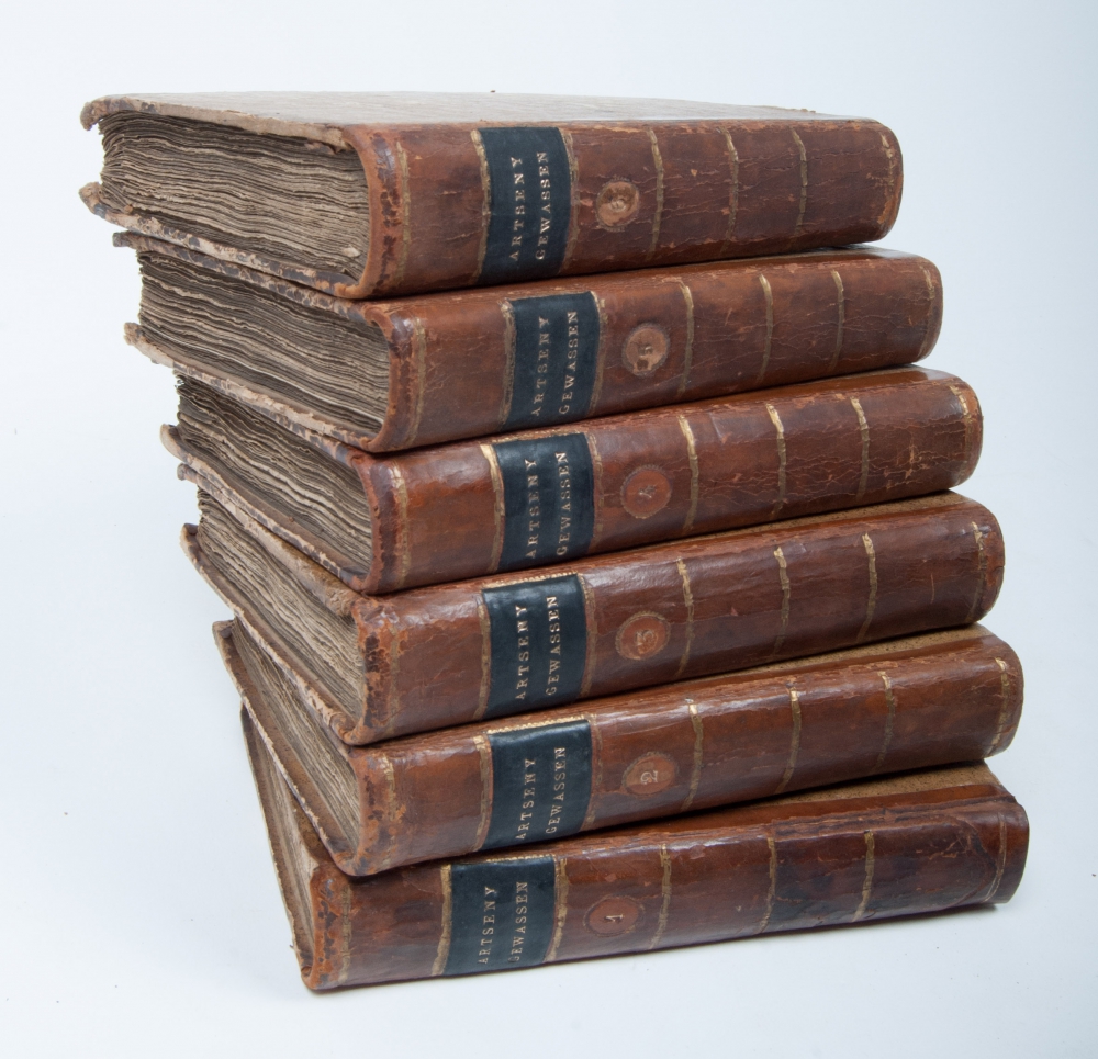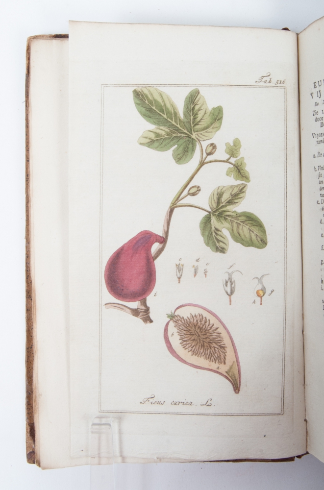 8vo. 6 volumes, half leather, title on spine in red and gilt stamping, 6x title page with illustrated vignette by R. Vinkeles (3x) and De L'Esdain (3x). Bindings slightly worn and with traces of use. Interior very good. The 600 plates in a fine contemporary colouration. Each volume contains 100 hand-coloured copperplates of medicinal plants and herbs with short descriptions in Dutch (from Houttuyn's Natuurlijke Historie) and in Latin (from Gmelin's edition of Linnaeus's Systema Natura) and an explanation of their pharmaceutical use in Dutch, adapated and translated by Dirk Leonard Oskamp, Martin Houttuyn and Johan Carl Krauss. First and only edition of this Dutch translation. The supplement by Ypey, published in 1813, is not included here.