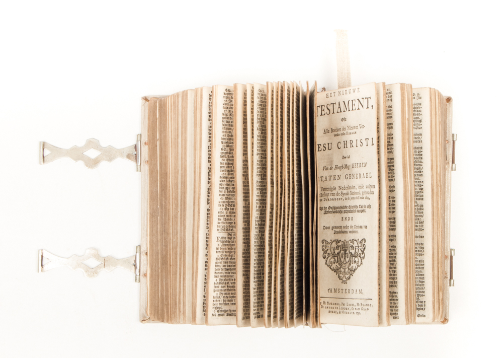 With: (Biblia, dat is De gantsche H. Schrifture vervattende alle de canonyke boekken des Ouden en des Nieuwen Testaments. Amsterdam, H. Burgers, P. Losel etc., 1751-1752), two volumes in one binding, with many added engraved plates in the OT and the NT and bound along Het boek der psalmen (Amsterdam, 1775), later leather with clamps, all edges gilt, thick 12mo (lacks title page, sold w.a.f.).