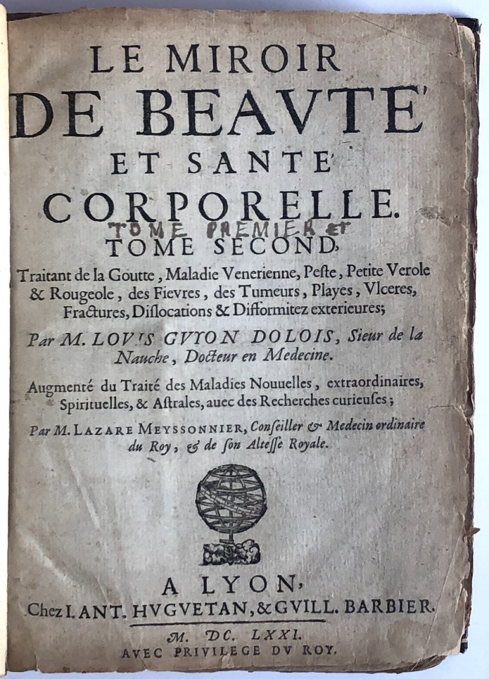 contenant le Miroir de Beauté et santé corporelle. Louis Guyon Dolois. Lyon, I. Ant. Huguetan, & Guill. Barbier, 1671. 2 parts in 1 vol. 2 folding plates and 10 pp. with engraved ills. on verso and recto. Halfleather, title gilt on spine, 4to.