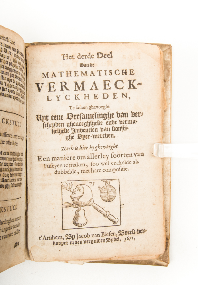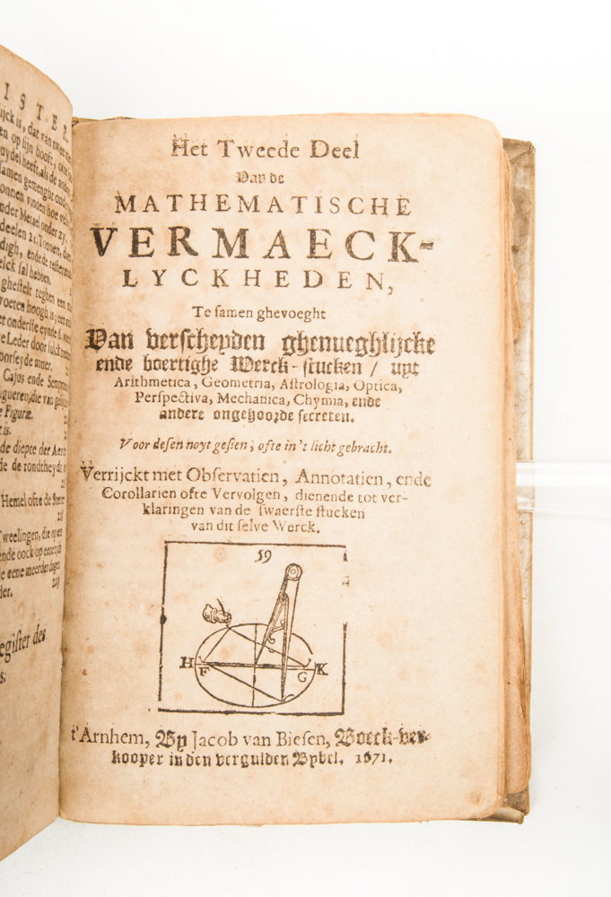 te samen gevoeght van verscheyden ghenuechelijcke ende boertighe werck-stucken / soo uyt arithmetica, geometria, astronomia (...). Getranslateert uyt Françoys in Nederduytsche tale: ende verrijckt, vermeerdert ende verbetert (...) Door Wynant van Westen, Mathem. der stadt Nymegen. [Volume 1:] Den vijfden druck, op nieuws oversien ende van vele druck-fauten verbetert. Arnhem, Jacob van Biesen, 1671 (volume 2 and 3) and 1672 (volume 1), three volumes in 1 binding, (16),229,(11); 55,(5); 34,(2) p., with woodcut illustrations, contemporary vellum.