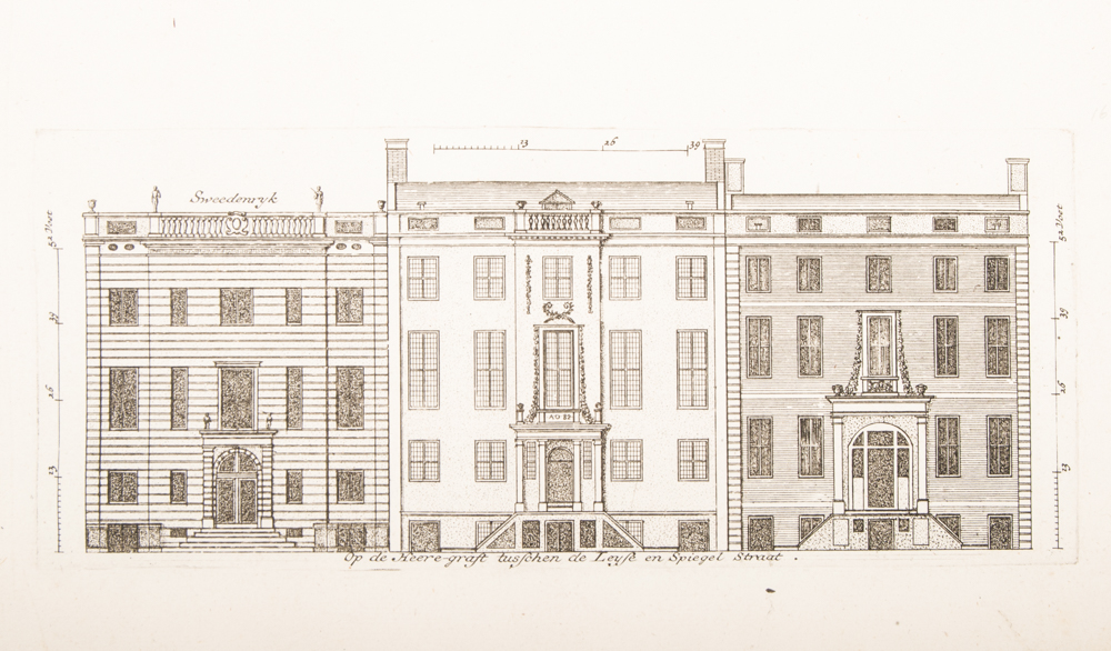 Extremely rare, complete set, initially published by Cornelis Danckerts, ca. 1696. Regarding the Stadhuys, plates are included of the facade, the back wall, one rear wall, two cross-sections of the building and three plans. Furthermore, included are views of the Trippenhuis and of houses on Herengracht (412 and 472, 444-448, 462-458, 466, 471-477, 474-478, 488-480) and Keizersgracht (526-518, 674-672, 738-730) (information Beeldbank Stadsarchief Amsterdam).