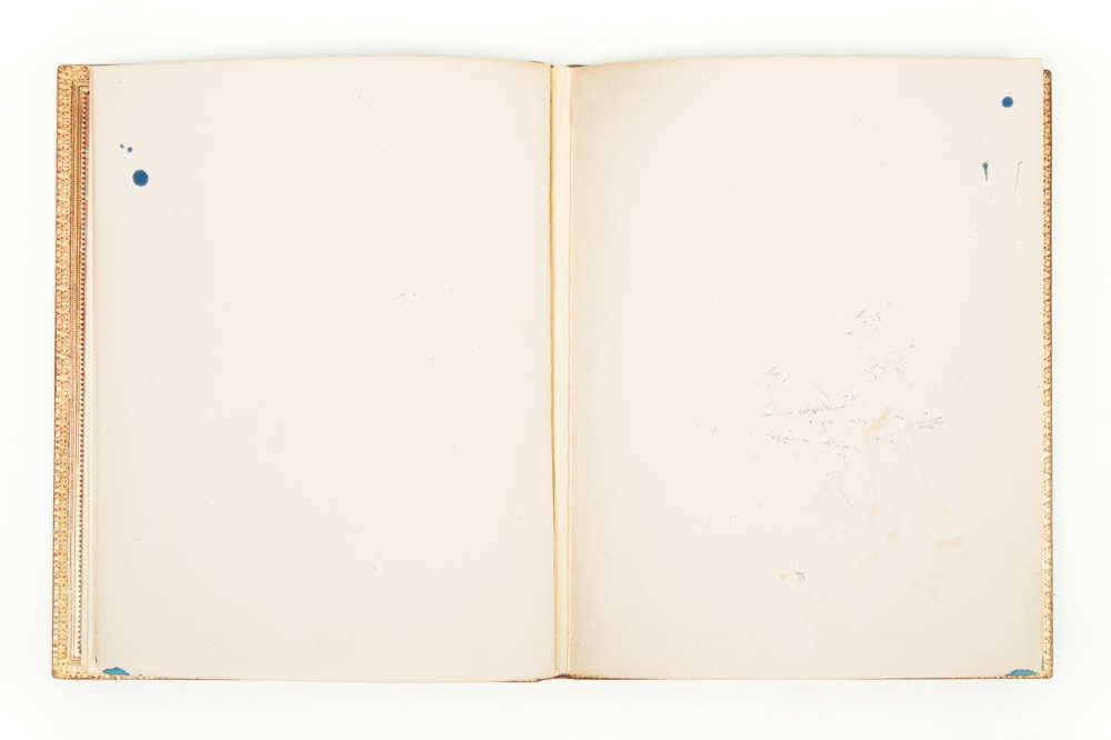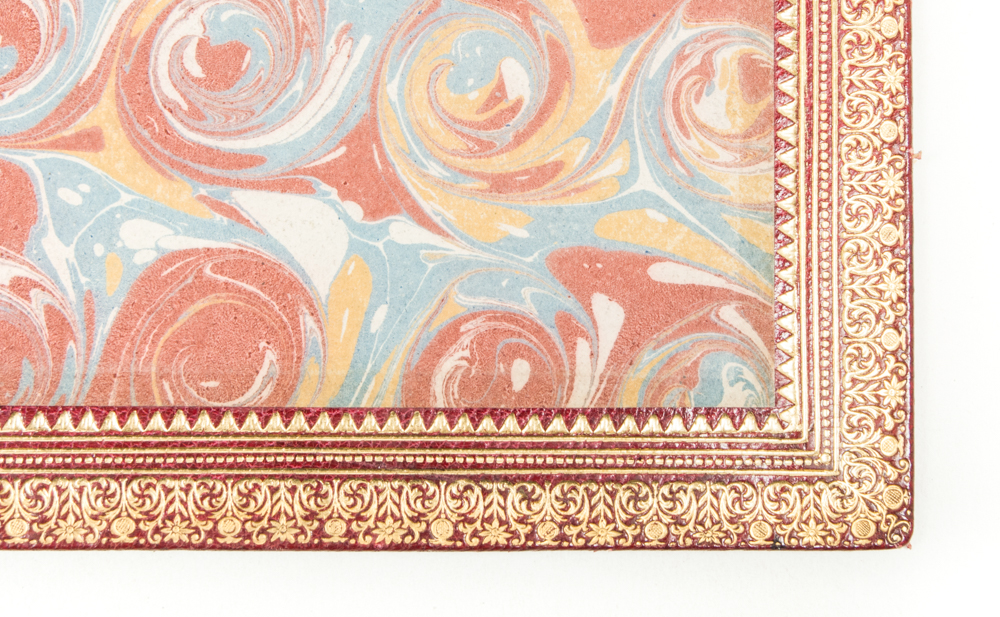 ca. 1900, front board with central gilt medallion, both boards and the 6 compartments in the ribbed back with multiple line borders, leather edges of the inside of the boards with rich, decorative border and inside front board signed "Durvand", marbled endpapers, cardboard slipcase, folio size.