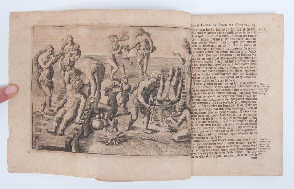 According to the title page, this concerns the first Dutch translation of these early 16th-century travel accounts. The first 39 pages and two plates concerning Florida. Furthermore with Reys-togten van Pamphilio de Narvaes (...) op 't Eiland Cuba (p. 40-47, no plates) and with Reis-togten van Vasco Nunez naar de Zuid-Zee (p. 48-77, two plates).