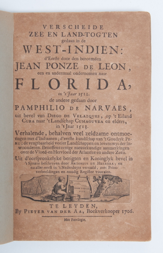 d'eerste door den beroemden Jean Ponze de Leon, een en andermaal ondernomen naar Florida, in 't jaar 1512. de andere gedaan door Pamphilio de Narvaes, uit bevel van Diego de Velazques, op 't eiland Cuba naar het landschap Cumaguey en elders, in 't jaar 1513. Verhalende, behalven veel zeldzame ontmoetingen met d'Ìndiaanen; d'eerste kundschap van 't Goudryk Peru (...). Uit d'oorsponkelyke berigten (...) in 't Spaans beschreven door Antonius de Herrera; en nu aller-eerst in 't Nederduyts vertaald, met Printverbeeldingen en noodig Register voorzien. Leiden, Pieter van der Aa, 1706, 77,(6 index) p., with 4 folding, engraved plates exactly as per the binder's index (numbered K1-K4), 20th-century cover (tanned/foxed).