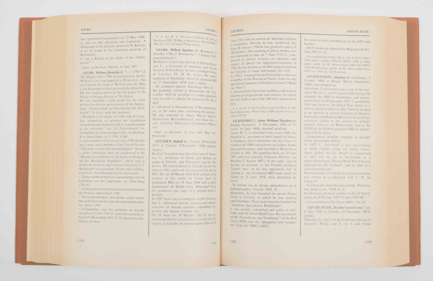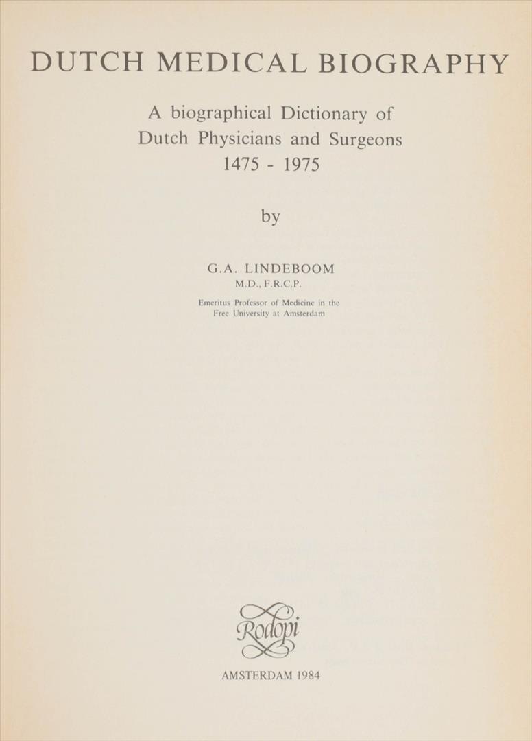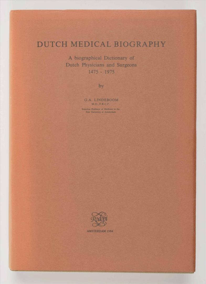 A biographical Dictionary of Dutch Physicians and Surgeons 1475-1975. Amsterdam, Rodopi, 1984. xiii, 2244[in columns], xv-xxxi p. Orig. cloth with dust jacket, large 8vo.