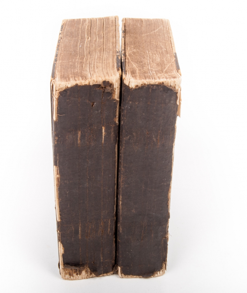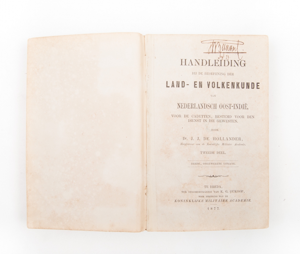 van Nederlandsch Oost-Indië, voor de cadetten, bestemd voor den dienst in die gewesten. Door Dr. J.J. de Hollander. Derde, omgewerkte uitgave. Breda, Broese & Comp., 1874/1877, 2 volumes, XX,890; XX,737,(1) p., 2 folding maps, contemporary uniform half cloth (various small defects, bindings worn).