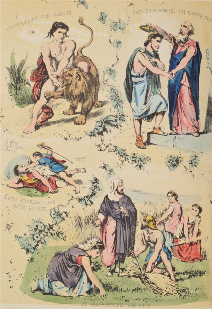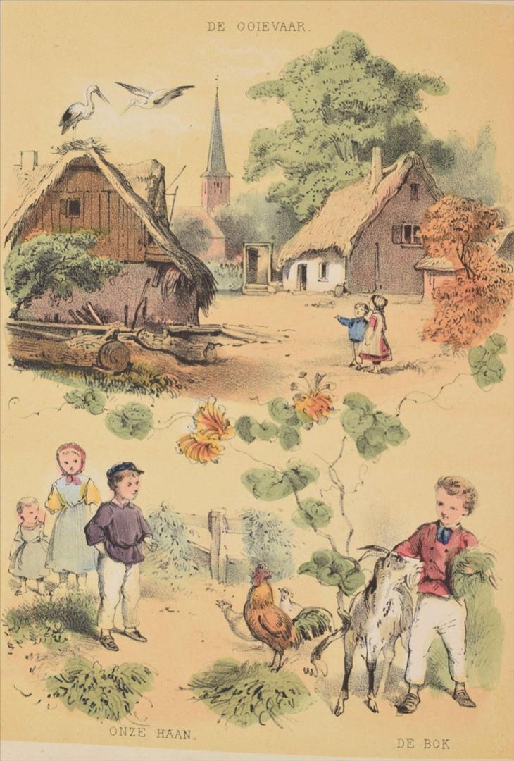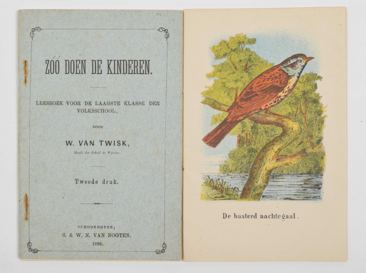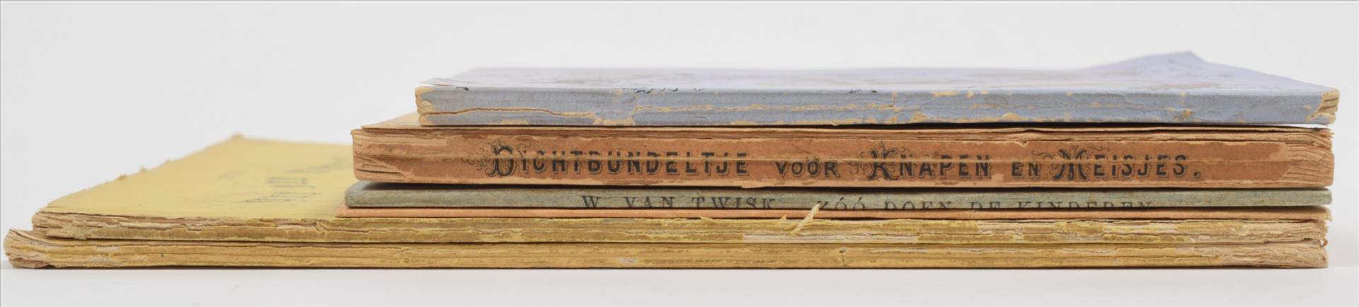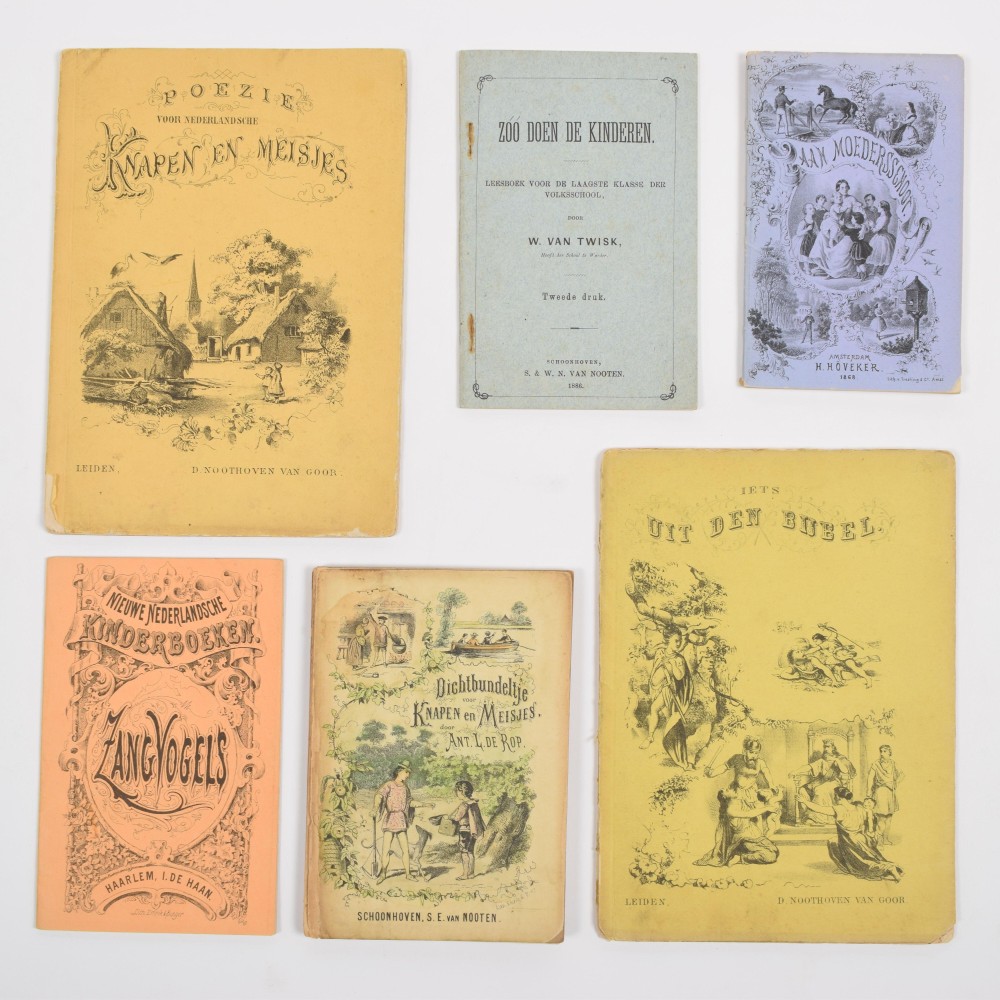 Haarlem, I. de Haan, 1875. + Zoo doen de kinderen. Leesboek voor de laagste klasse der volksschool. W. van Twisk. Schoonhoven, S. & W.N. van Nooten, 1886. 2nd ed. + Aan moeders schoot. Proeve van kindergedichtjes. P.J. Moeton. Amsterdam, H. Hoveker, 1868. Back sl. worn, cover has minor tears + Dichtbundeltje voor Knapen en Meisjes. Ant. L. de Rop. Schoonhoven, S.E. van Nooten, 1871. Front board loose + Poezie voor Nederlandse Knapen en Meisjes. Leiden, D. Noothoven van Goor, 1868. With 4 chromolithographs, sl. worn and quires shabbily cut + Iets uit den Bijbel. Leiden, D. Noothoven van Goor, 1876.