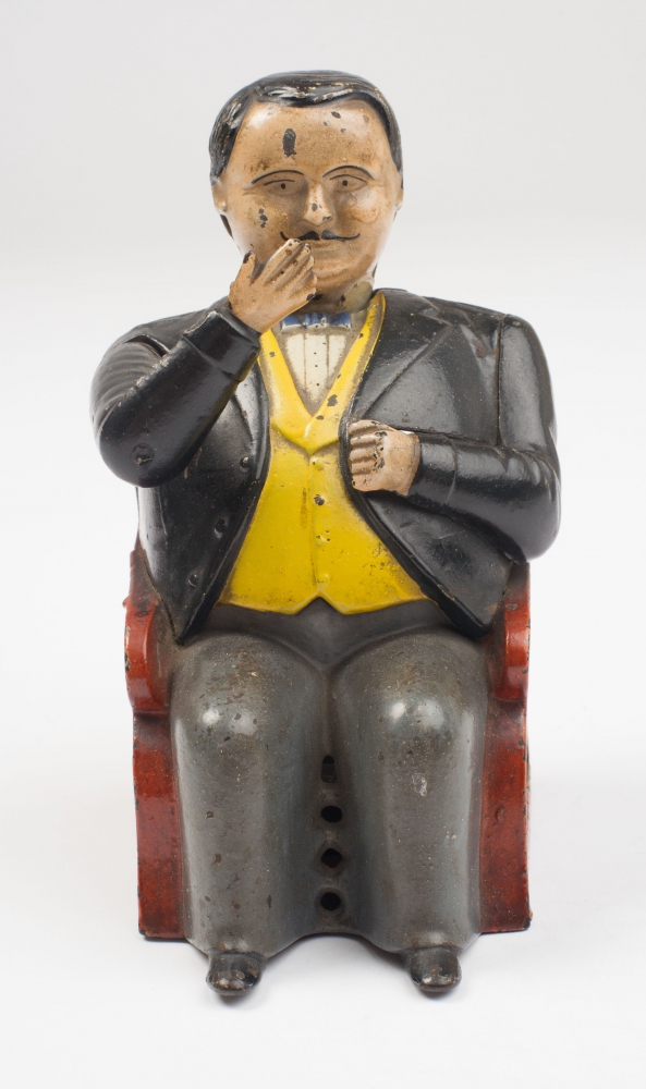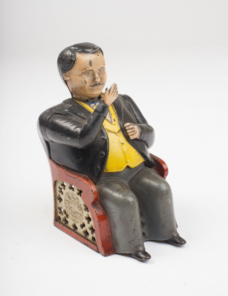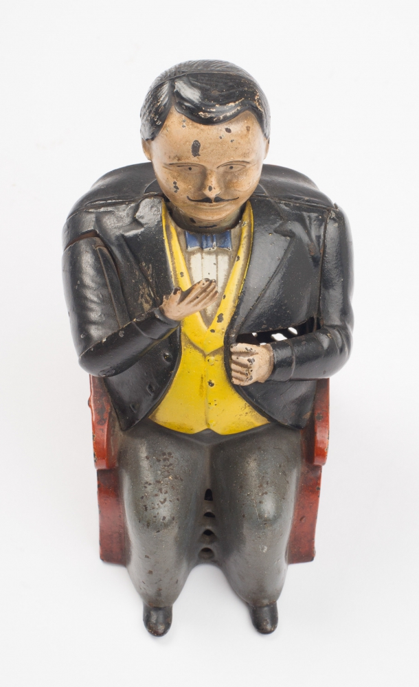 "Tammany" Bank, J. & E. Stevens Co., 19th century. Stamp "Pat. dec. 23 1873". Mechanism not functioning, else in good condition, nearly no damage to varnish.