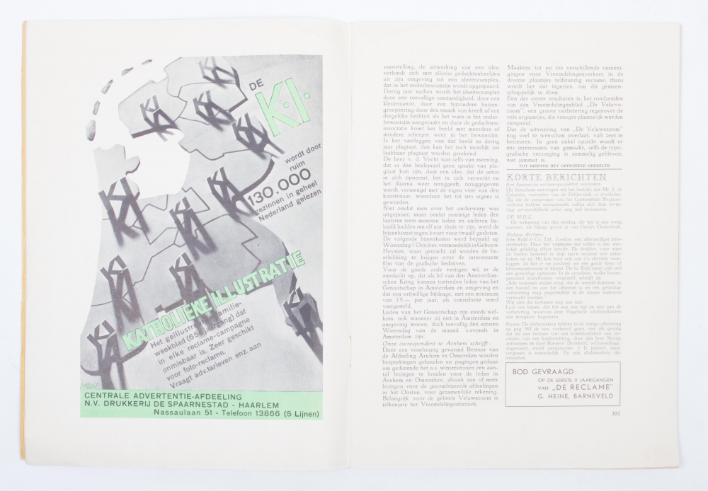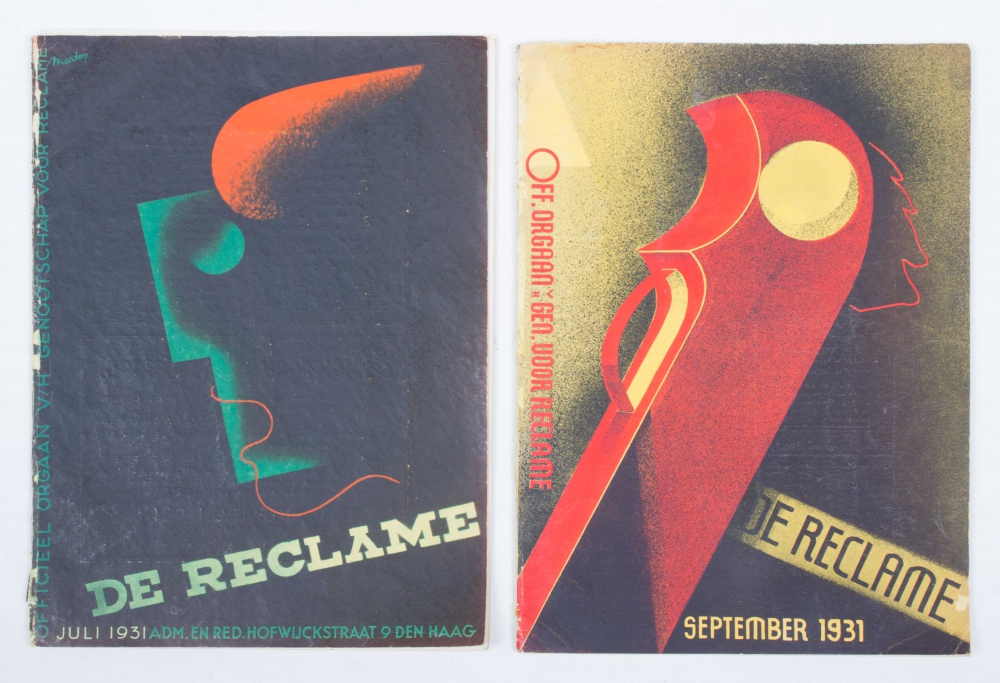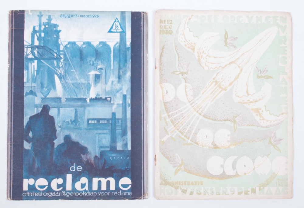 Officieel orgaan v/h genootschap voor reclame. 37 issues of this magazine from ca. 1930-1934 with cover designs by F. Funke and others. Damaged issues with nearly all supplements removed.