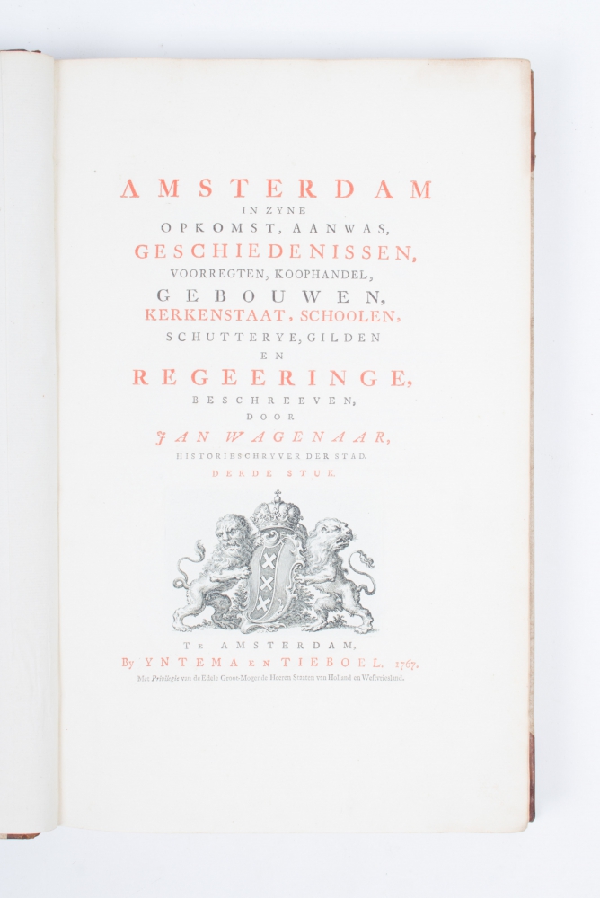 voorregten, koophandel, gebouwen, kerkenstaat, schoolen, schutterye, gilden en regeeringe, beschreeven door Jan Wagenaar, historieschryver der stad. Amsterdam. Isaak Tirion. Yntema en Tieboel. [3 volumes]. 1760-1765 and 1767.