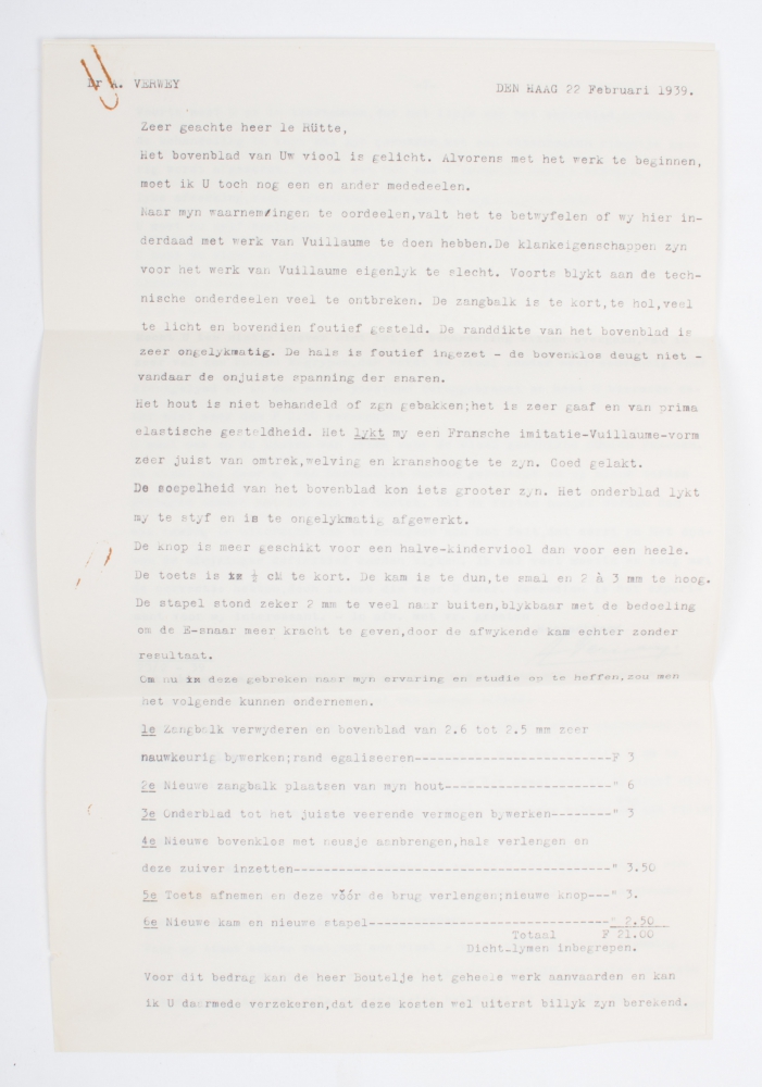 Typed report to Le Rütte by violin maker A. Verwey, concerning the restoration of Le Rütte's violin, 3 pages of 34 x 22 cm., dated The Hague, 22 February 1939, in the original envelope.