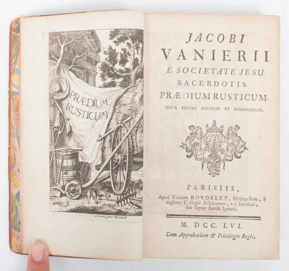 On the author Jacques Vanière (1664-1739), see: https://fr.wikipedia.org/wiki/Jacques_Vani%C3%A8re. His book Praedium Rusticum discusses the work and the pleasure of the countryside, finely depicted in the 16 plates. It appeared for the first time in 1682 (in 10 chapters), only in 1730 did an edition similar to ours with 16 chapters appear.