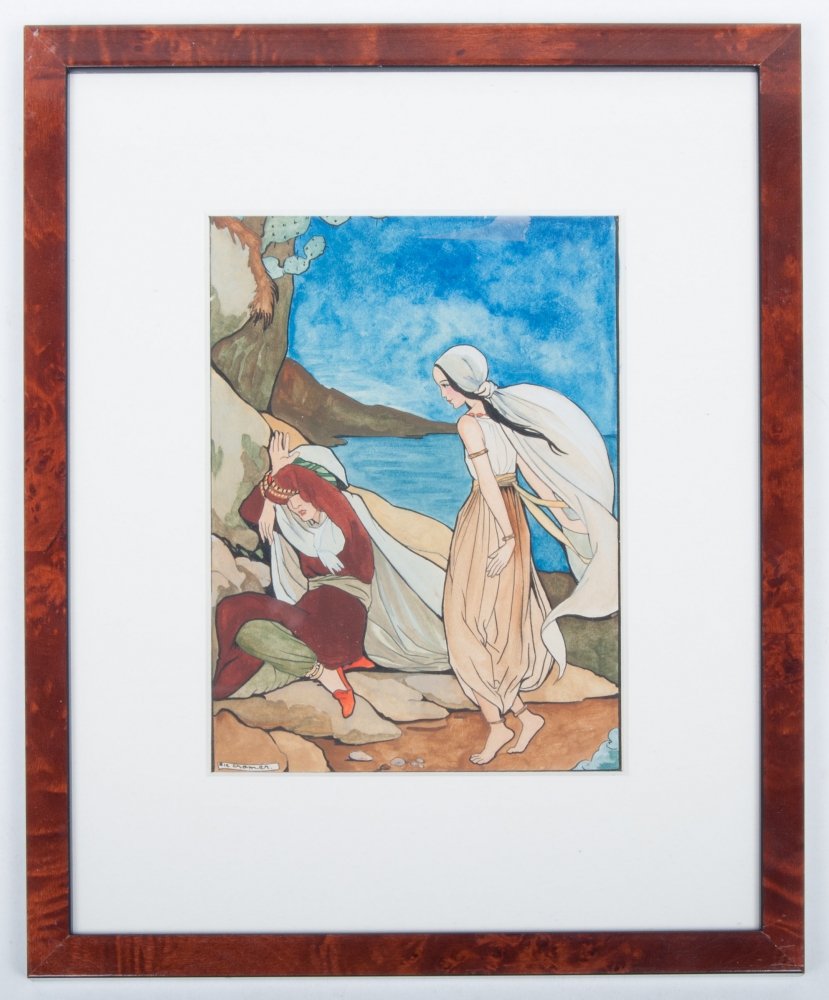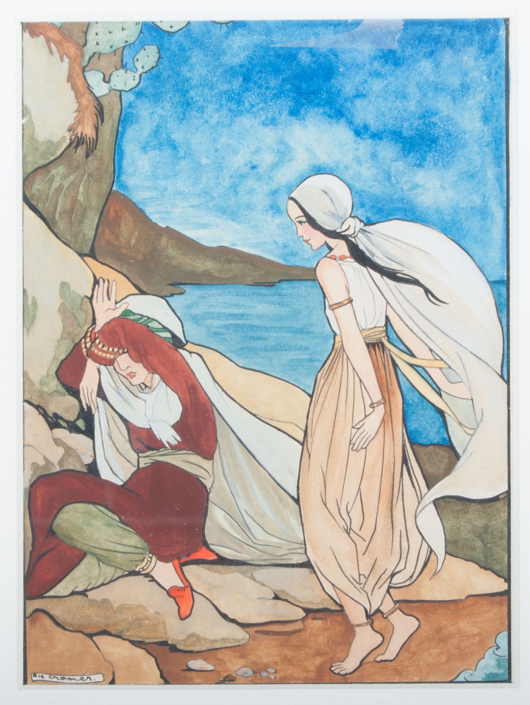Watercolour. Scene from one of the Arab fairy tales illustrated by Cramer. 19 x 14 cm. Mounted in frame. Ca. 1920. Signed.