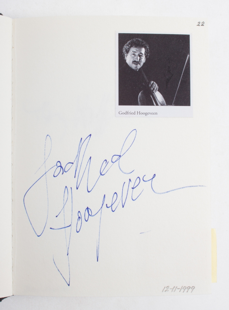 compiled book with a total of 79 signatures of renowned musicians with photo and curriculum. Signatures of Wynton Marsalis, Philip Glass, Bernard Haitink, Philippe Herreweghe, Kurt Masur, Natalia Gutman, Ken-Ichiro Kobayashi and many other musical greats.