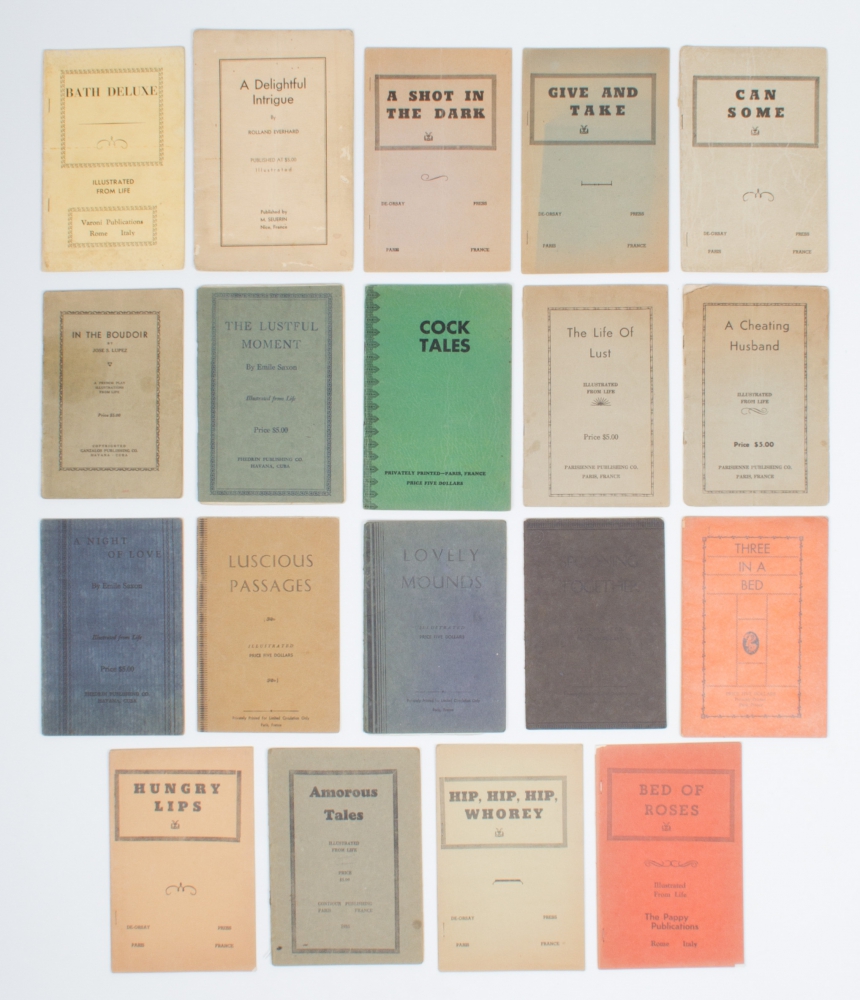 A Delightful Intrigue by Rolland Everhard. Published at $5.00 Illustrated. Published by M. Seuerin Nice, France, ca. 1960. 30 pp. + Bath Deluxe. Illustrated from life. Varian Publications Rome, Italy. 32 pp. + Amorous Tales. Contour Publishing Paris, France, 1935 - and 16 more. All stapled and with photo pages.