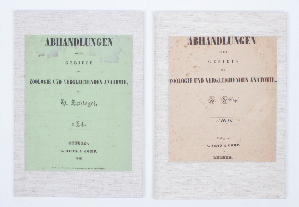 Abhandlungen aus dem gebiete der zoologie und vergleichenden anatomie I Heft & II Heft. Hermann Schlegel, Leiden, Arnz, 1841-43 - Heft 1: (4),44 pp. with 6 plates. Heft 2: 12 pp. and 3 plates. Expertly rebound in cloth using orig. boards. Here and there aging stains. 2 of 3 volumes (lacks vol. 3).