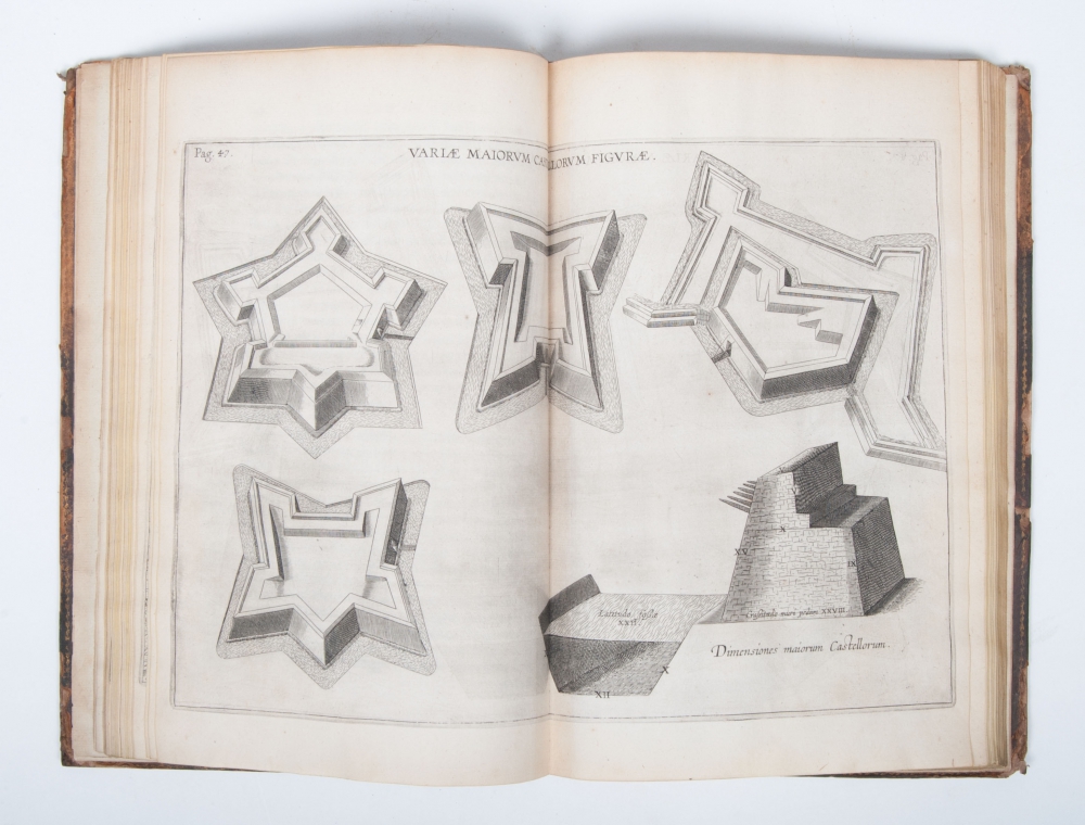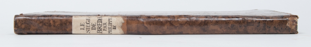Leather binding, small folio, spine with pasted title in ms., (10),163,(15),(2) pp. The allegorical frontispiece in copperplate with e.g. the arms of Spain and Breda, finely designed by Cornelis Galle. Complete with 13 full- or double-page copperplates of maps and fortifications and another 2 woodcuts in the text. The engraving on p. 11 covered with the image of the engraving on p. 35 and the engraving on p. 35 covered with the image of the engraving on p. 11, spine and binding with traces of use, var. pages tanned, var. water stains, else good.
