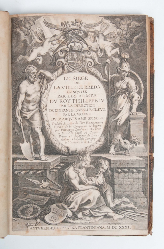Conquise par les armes du roy Philippe IV. Par la direction de l'Infante Isabelle CL. Eug. par la du Marquis Amb. Spinola. Traduit du Latin du Pere Harmannus Hugo (...) Antwerp. Officina Plantiniana, 1631. [First French edition].